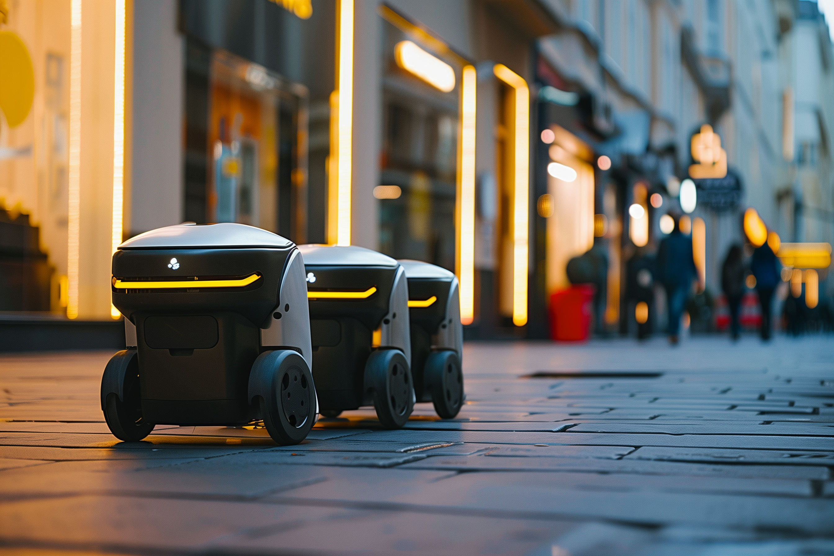 Das Bild zeigt drei autonome Roboter, die in einer Fußgängerzone abgestellt sind. Die Roboter sind in einem schwarzen, modernen Design gehalten und haben gelbe Akzente, die sie auch in der abendlichen Beleuchtung gut sichtbar machen. Sie stehen auf einem Kopfsteinpflaster-Boden vor Fassaden und Geschäften, die in warmen Farben erleuchtet sind.