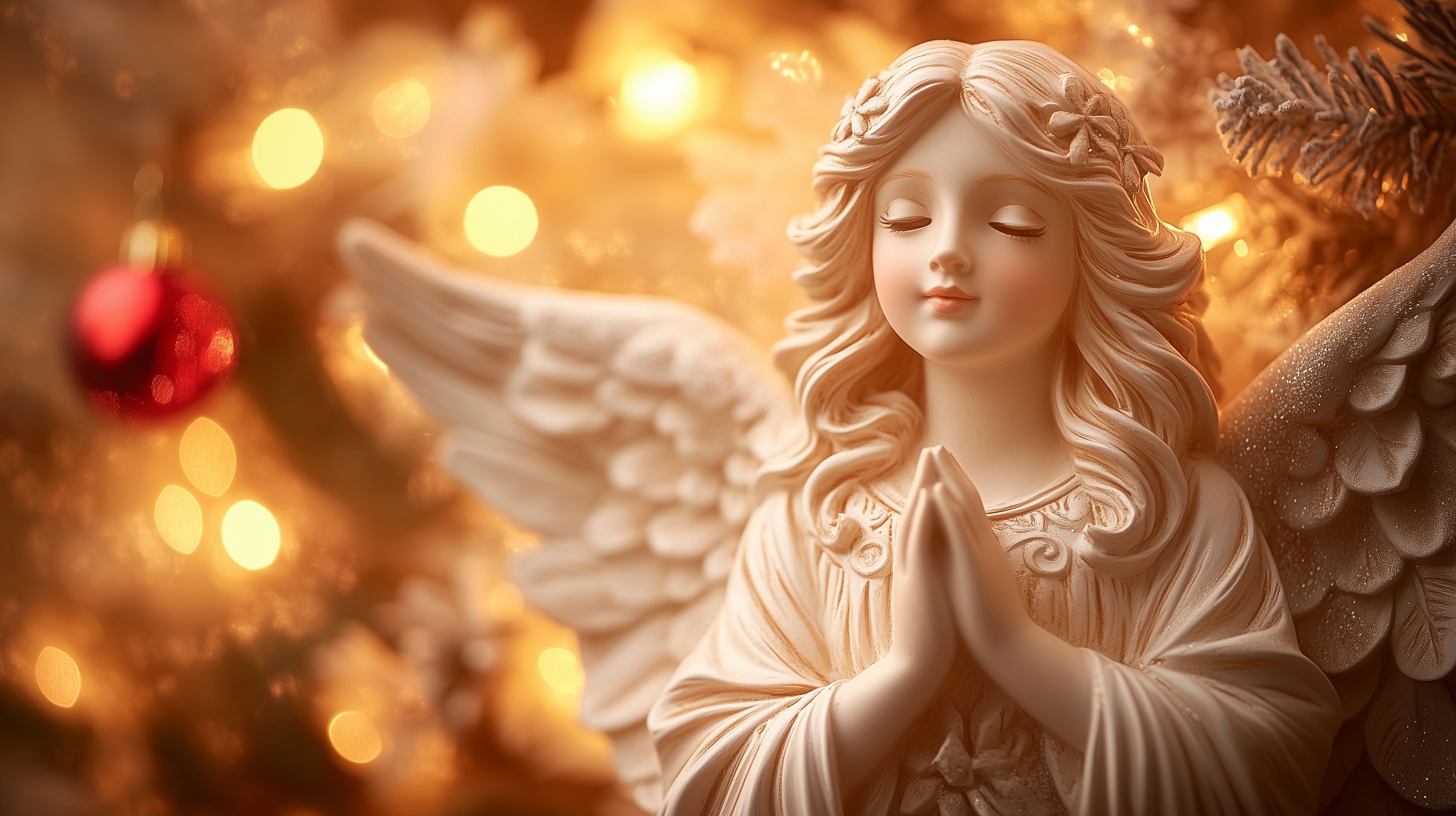Dieses stimmungsvolle Foto zeigt eine detailliert gestaltete Engelsfigur, die vor einem Hintergrund von funkelnden Lichtern und Weihnachtsdekor platziert ist. Die zarte, weiße Statuette hebt sich vor dem warmen, goldfarbenen Lichterspiel ab und verleiht der Szene eine besinnliche, feierliche Atmosphäre. Der Engel mit seinen kunstvoll verzierten Flügeln und dem betenden Gestus vermittelt ein Gefühl von Ruhe, Frieden und Spiritualität. Dieses hochauflösende Stockfoto eignet sich ideal für Weihnachtsgrüße, Dekorationen, Blogbeiträge oder Werbekampagnen rund um die Feiertage und kann unter einer Creative-Commons-Lizenz verwendet werden.
