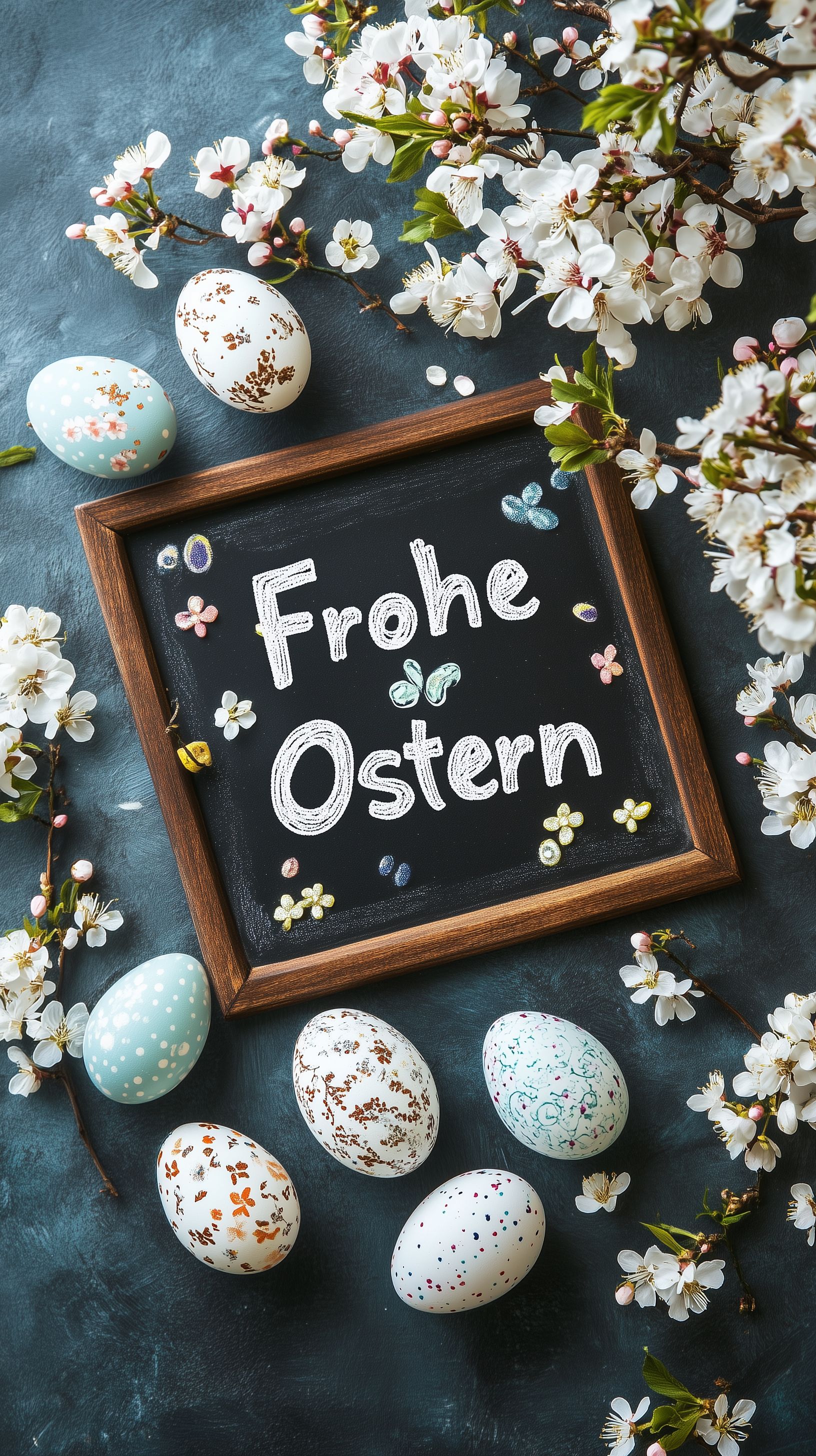 Dieses stimmungsvolle Osterfoto zeigt eine rustikale Schiefertafel mit der handgeschriebenen Aufschrift 'Frohe Ostern' umgeben von zarten Kirschblüten und bemalten Ostereiern auf einem dunklen Untergrund. Die natürliche, frühlinghafte Komposition in Pastelltönen strahlt eine festliche und klassische Osternstimmung aus. Dieses hochauflösende Stockfoto eignet sich hervorragend für Oster-Designs, Grußkarten, Blogbeiträge oder Werbematerial rund um das Osterfest und den Frühling. Es steht unter einer Creative-Commons-Lizenz zur Verfügung.