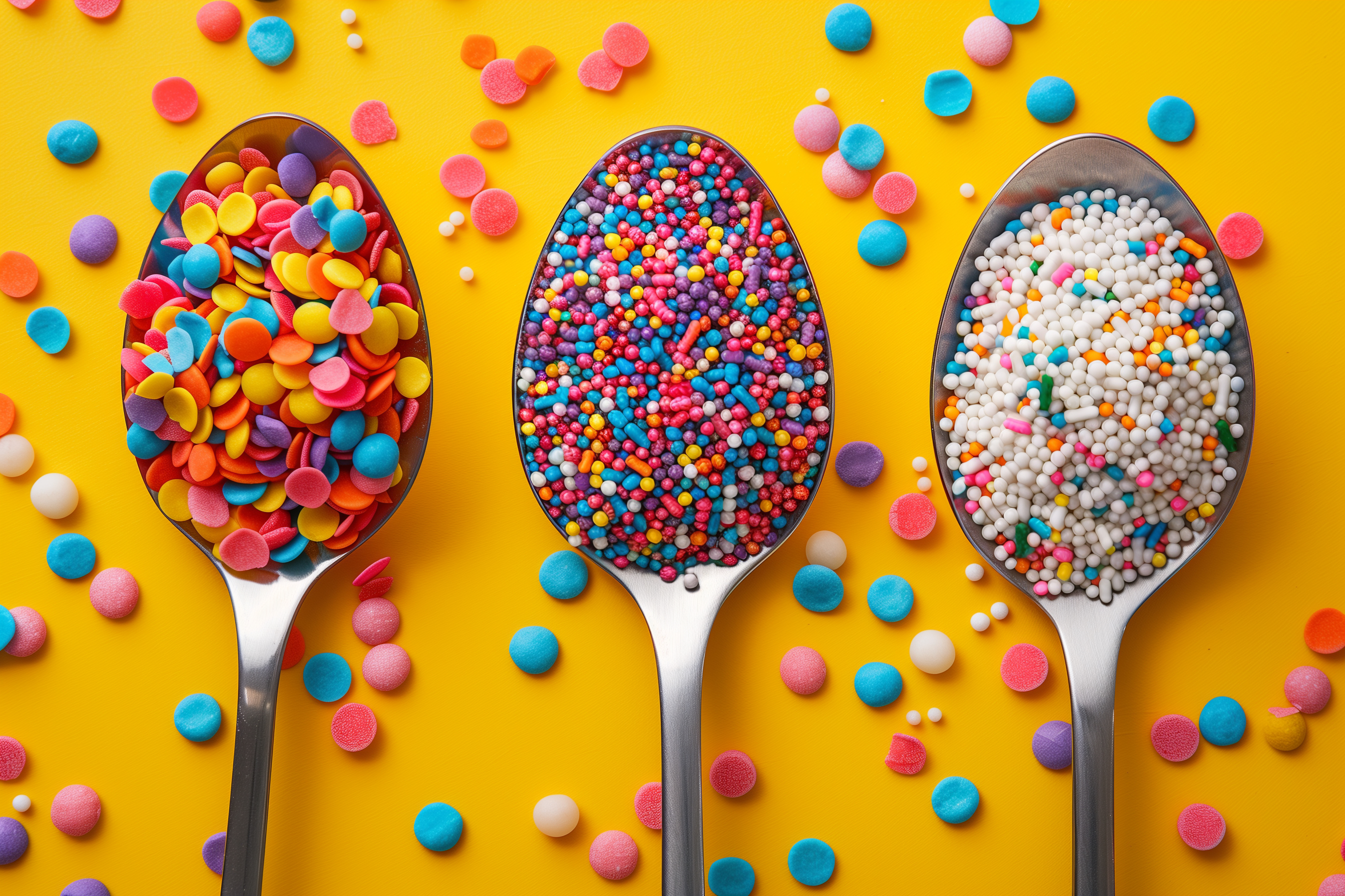 Das Bild zeigt eine Vielzahl bunter Süßigkeiten in drei Löffeln auf gelbem Hintergrund. Die Süßigkeiten in verschiedenen Formen, Größen und Farben - darunter Gummibärchen, Dragees und Bonbons - sind kreativ und fantasievoll angeordnet. Das Foto besticht durch seine lebendige Farbpalette und lädt ein, die leckeren Süßwaren näher zu betrachten. Dieses kostenlose Stockfoto in hoher Auflösung unter Creative Commons-Lizenz eignet sich hervorragend für Blogs, Newsletter, Social-Media-Beiträge und Werbematerialien rund um Süßigkeiten, Lebensmittel, Ernährung oder Kulinarik.