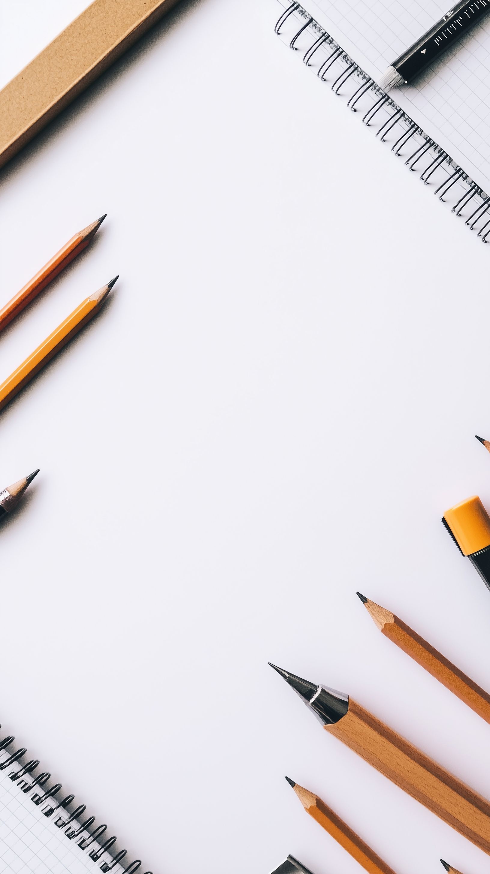 Das Bild zeigt verschiedenes Schulmaterial, das auf einem weißen Hintergrund arrangiert ist. Zu sehen sind Bleistifte, Radiergummis, ein Lineal, ein Notizblock sowie ein schwarzer Stift. Die Objekte sind symmetrisch und minimalistisch auf der Fläche platziert, was eine aufgeräumte und aufgeräumte Optik vermittelt. Dieses Foto eignet sich hervorragend als Hintergrund oder Mockup für Bildungsthemen, Schreibwarendesign, Bürobedarf oder kreative Layouts. Als hochauflösendes Stockfoto unter der Creative-Commons-Lizenz kann es kostenfrei für private und kommerzielle Zwecke genutzt werden.