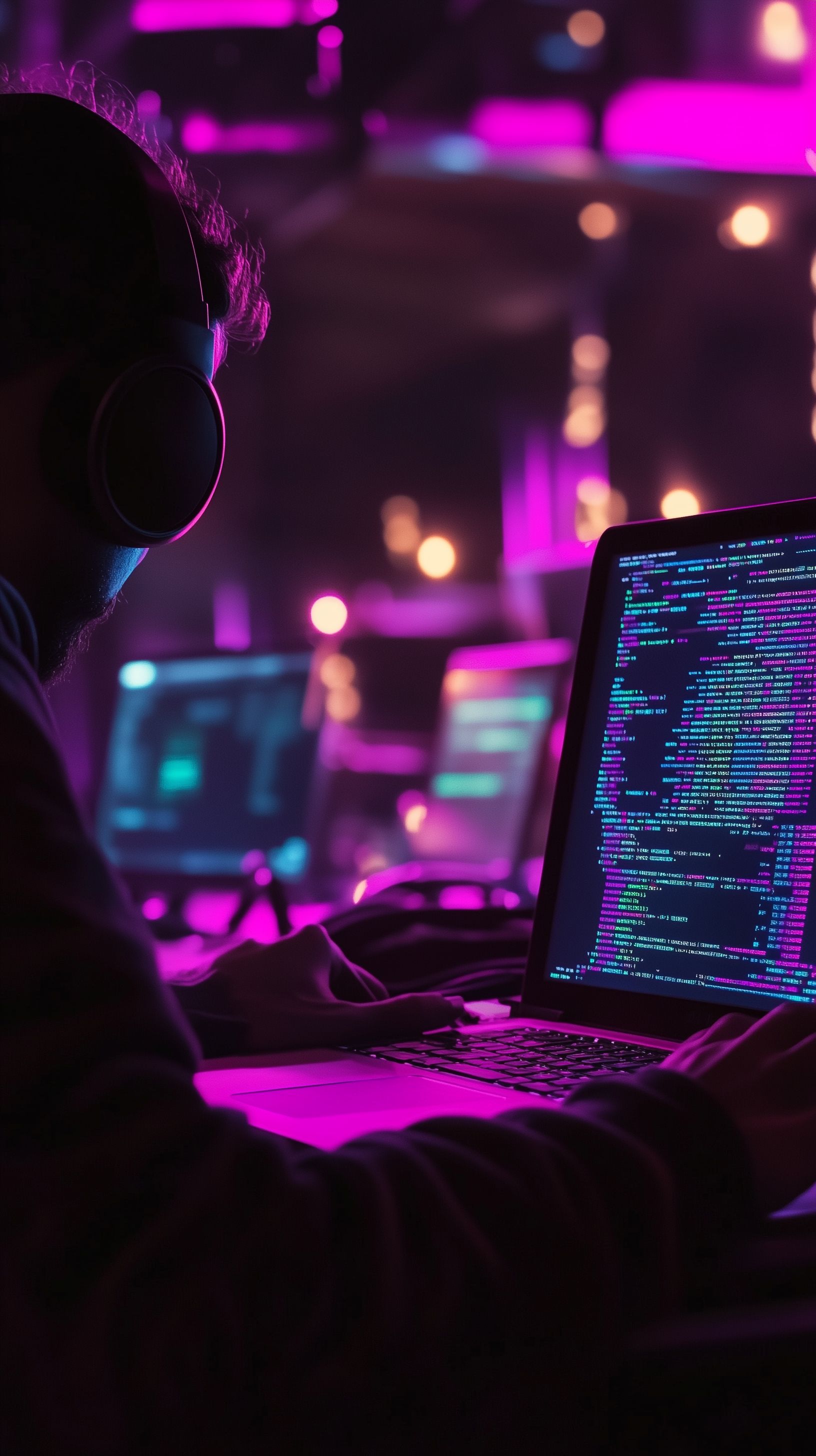Das Foto zeigt einen konzentrierten Programmierer, der in der Dunkelheit an seinem Laptop arbeitet. Bunte Neonfarben erleuchten den Arbeitsplatz, was eine intensive und fokussierte Atmosphäre vermittelt. Die Perspektive ist von hinten aufgenommen, wodurch die Silhouette des Programmierers im Vordergrund steht. Dieses Stockfoto eignet sich hervorragend für Blogs, Newsletter, Social-Media-Beiträge oder Werbematerialien rund um die Themen Technologie, IT, Software-Entwicklung und Digitalisierung. Es ist in hoher Auflösung verfügbar und steht unter einer Creative-Commons-Lizenz zur Verfügung.