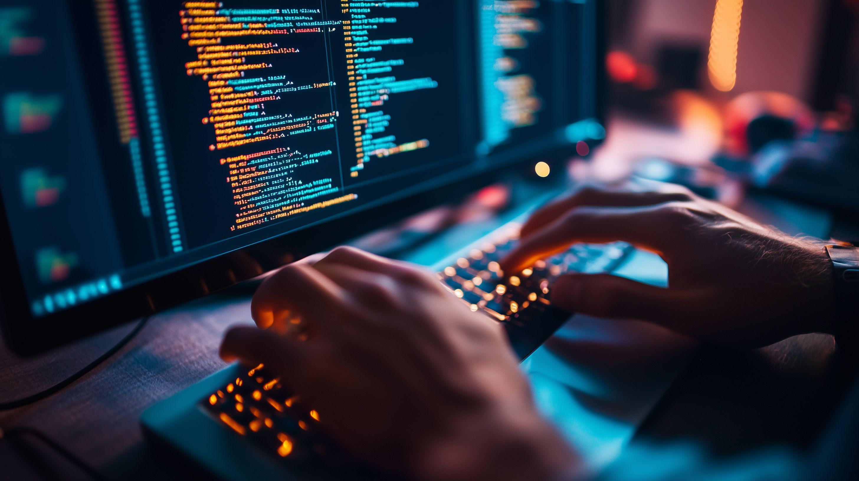 Dieses Bild zeigt einen Computerprogrammierer, der bei Nacht konzentriert an seinem Laptop arbeitet. Der Bildschirm ist mit farbigem Code erhellt und die Hände des Programmierenden sind auf der Tastatur zu sehen. Das Bild vermittelt eine intensive, kreative Atmosphäre der Softwareentwicklung und Problemlösung. Es eignet sich hervorragend für den Einsatz in Blogs, Newslettern oder Social-Media-Beiträgen rund um Themen wie Digitalisierung, IT-Technologie und Softwareentwicklung. Das hochauflösende Stockfoto steht unter einer Creative-Commons-Lizenz zur freien Nutzung zur Verfügung.