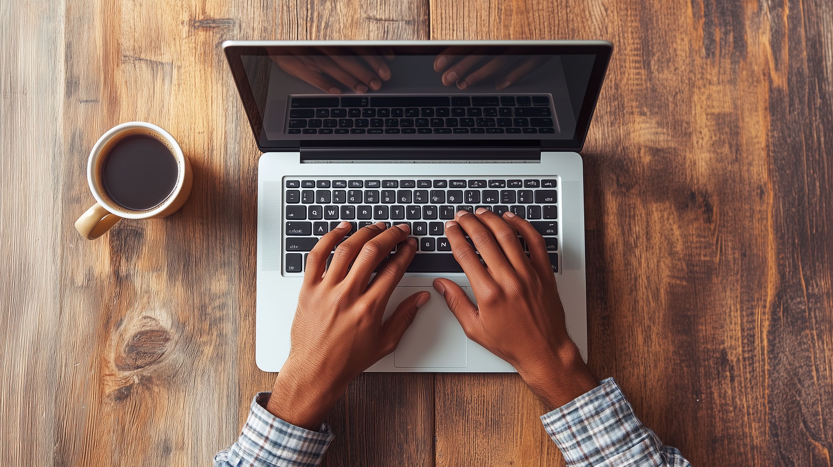 Das Bild zeigt einen Arbeitsplatz mit einem Laptop, einer Kaffeetasse und einer Person, die auf der Tastatur tippt. Der Arbeitsplatz befindet sich auf einem rustikalen Holztisch, was eine gemütliche und produktive Atmosphäre vermittelt. Das Foto eignet sich gut für Geschäftskonzepte, Newsletter, Blogbeiträge oder Social-Media-Posts zum Thema Produktivität, Arbeitsumgebung oder digitale Geräte. Als hochwertiges, kostenloses Stockfoto unter einer Creative-Commons-Lizenz kann es in verschiedenen Kontexten eingesetzt werden.