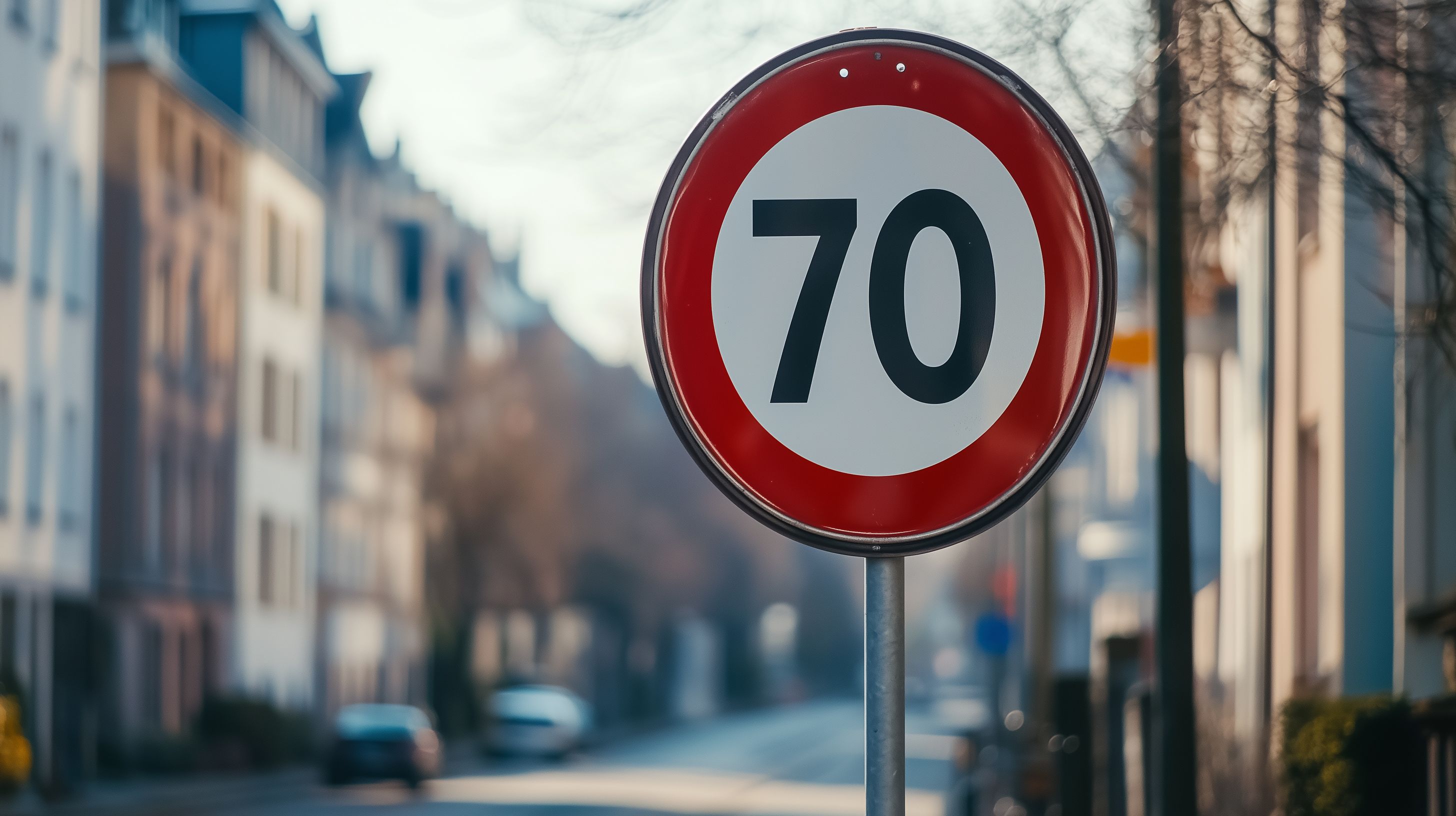 Das Bild zeigt ein Verkehrsschild, das eine Geschwindigkeitsbegrenzung von 70 km/h in einer städtischen Umgebung anzeigt. Das Schild ist deutlich im Vordergrund fokussiert, während im Hintergrund die verschwommenen Fassaden von Gebäuden zu sehen sind. Die Farbgebung des Schildes, das Rot und Weiß mit schwarzen Ziffern, kontrastiert stark mit dem grauen und blauen Hintergrund. Dieses Stockfoto eignet sich hervorragend für die Verwendung in Artikeln, Blogbeiträgen oder Werbematerialien zum Thema Verkehrssicherheit, Rechtliche Bestimmungen im Straßenverkehr oder Stadtplanung. Das hochauflösende Bild steht unter der Creative-Commons-Lizenz und kann kostenlos genutzt werden.