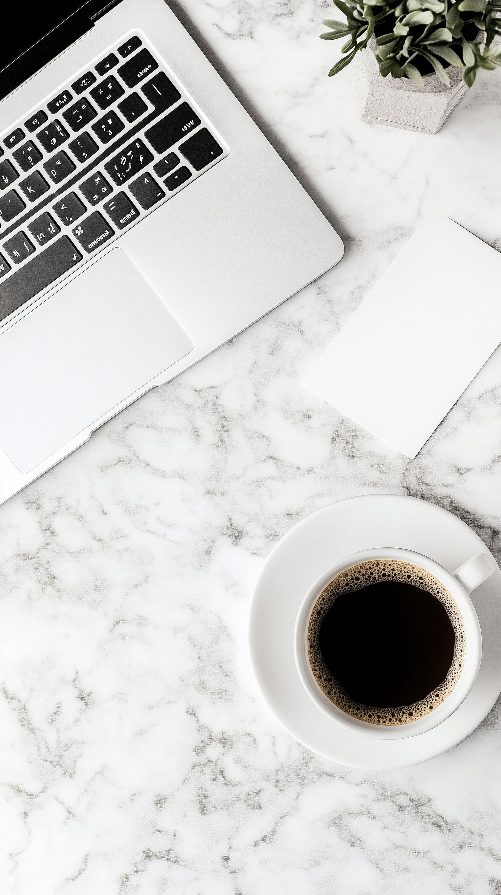 Das Bild zeigt ein modernes, minimalistisches Arbeitsplatz-Arrangement auf einer Marmor-Oberfläche. Im Zentrum steht ein aufgeklappter Laptop, daneben eine Tasse Kaffee. Eine kleine Topfpflanze ergänzt den cleanen Look. Die klare, geradlinige Komposition und schlichte Farbgebung in Weiß und Schwarz vermitteln einen Eindruck von Professionalität und Konzentration. Dieses Stockfoto eignet sich hervorragend für den Einsatz in Blogbeiträgen, E-Mail-Newslettern, Social-Media-Posts oder Werbematerialien rund um Themen wie Büroorganisation, Produktivität, Work-Life-Balance oder den modernen, digitalen Arbeitsplatz. Das Foto ist in hoher Auflösung und unter einer Creative-Commons-Lizenz kostenlos verfügbar.