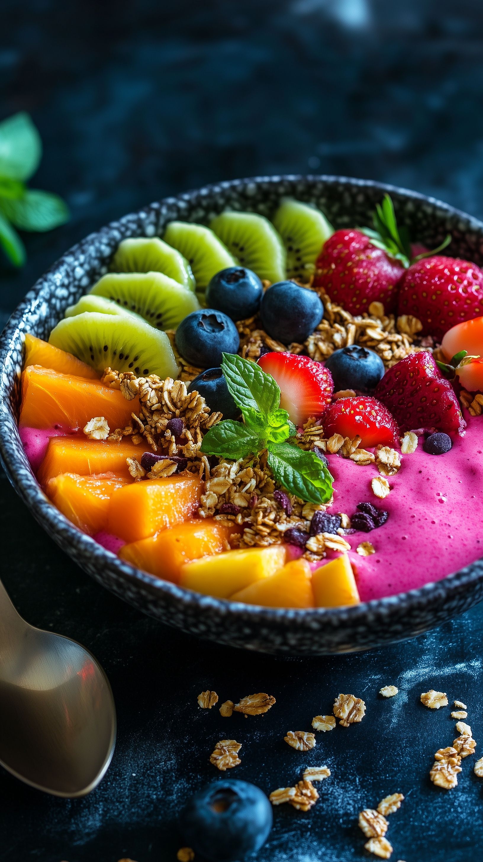 Dieses farbenprächtige Foto zeigt eine Smoothie-Schale gefüllt mit einem bunten Mix aus frischen Früchten, Beeren und knusprigem Müsli. Die Schale steht auf einem dunkelblauen Untergrund, wodurch die leuchtenden Farben der Zutaten besonders gut zur Geltung kommen. Die Komposition ist stilvoll und einladend, perfekt für einen gesunden Start in den Tag oder als Snack zwischendurch.