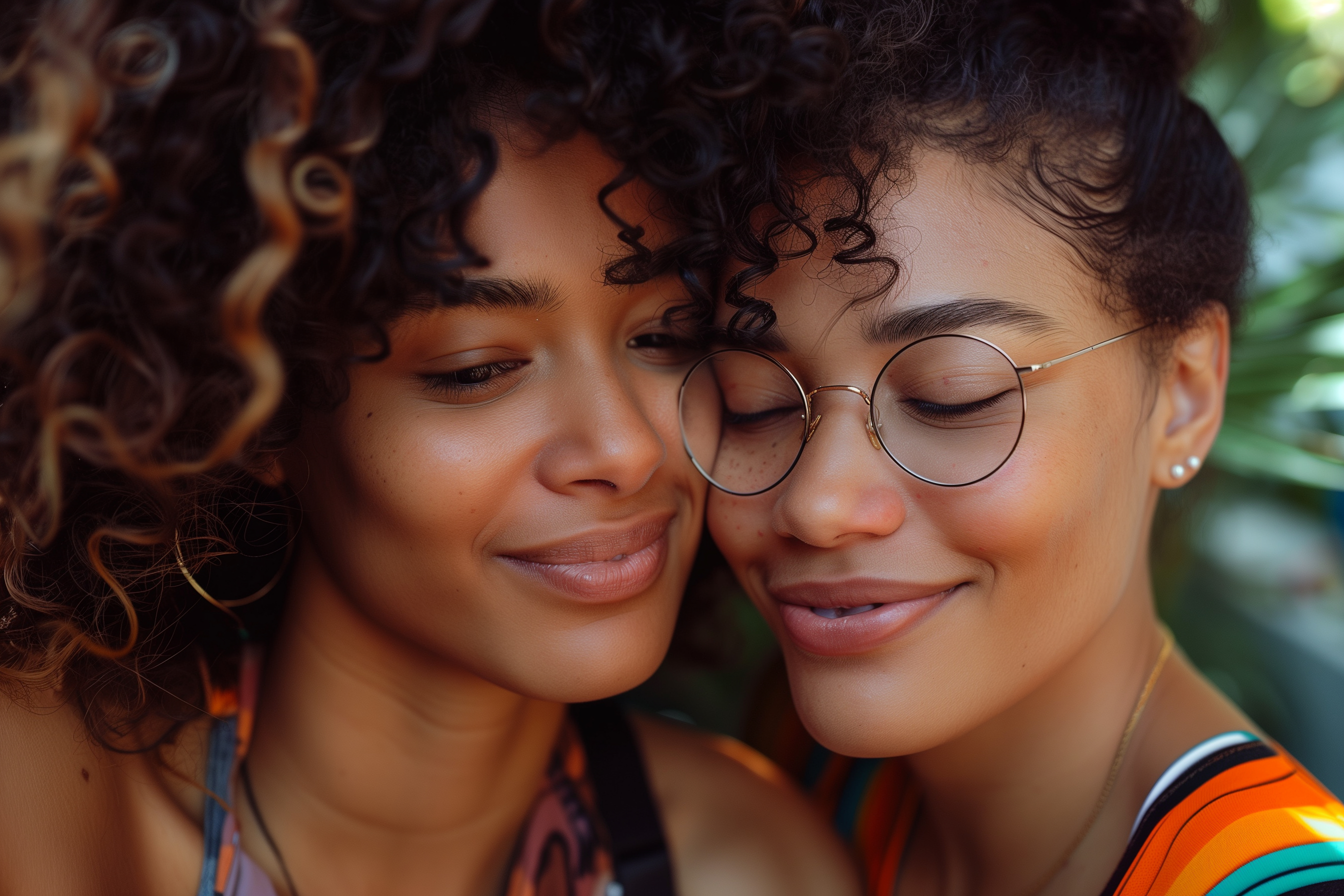 Das Bild zeigt zwei lächelnde Frauen, die sich liebevoll umarmen. Sie sind in der Natur, vor einem unscharfen, grünen Hintergrund, zu sehen. Eine der Frauen trägt eine Brille mit rundem Gestell und ihre Haare sind lockig. Die andere Frau hat ebenfalls lockige Haare. Beide strahlen Fröhlichkeit und Zuneigung aus. Dieses Foto eignet sich hervorragend für den Einsatz in Blogs, Newslettern, sozialen Medien und Werbematerialien, die ein positives, diversitätsfreundliches Bild zeigen möchten. Es ist ein kostenloses Stockfoto in hoher Auflösung, das unter einer Creative-Commons-Lizenz veröffentlicht wurde.