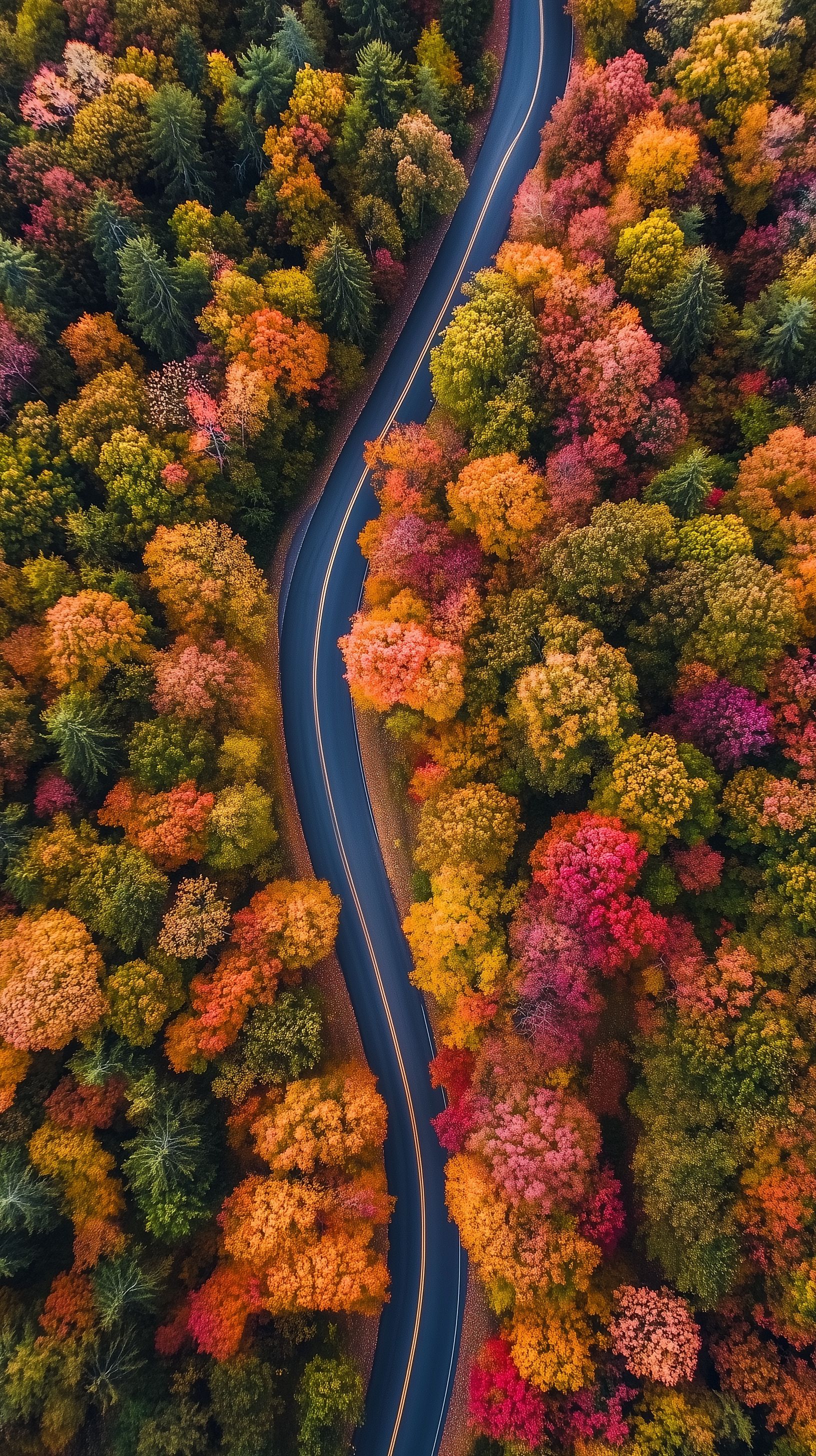 Diese eindrucksvolle Luftaufnahme zeigt eine gewundene Straße, die sich durch einen herbstlich gefärbten Wald schlängelt. Die Bäume erstrahlen in einem Farbenmeer aus Rot, Orange, Gelb und Grün, die ein malerisches Bild der Natur in ihrer ganzen Pracht formen. Die Serpentinen der Straße führen den Betrachter durch diese bezaubernde Umgebung, die ideal als Hintergrundbild für Blogs, Newsletter, Social-Media-Beiträge oder Werbematerial geeignet ist. Dieses hochauflösende Stockfoto ist unter Creative Commons-Lizenz frei nutzbar.