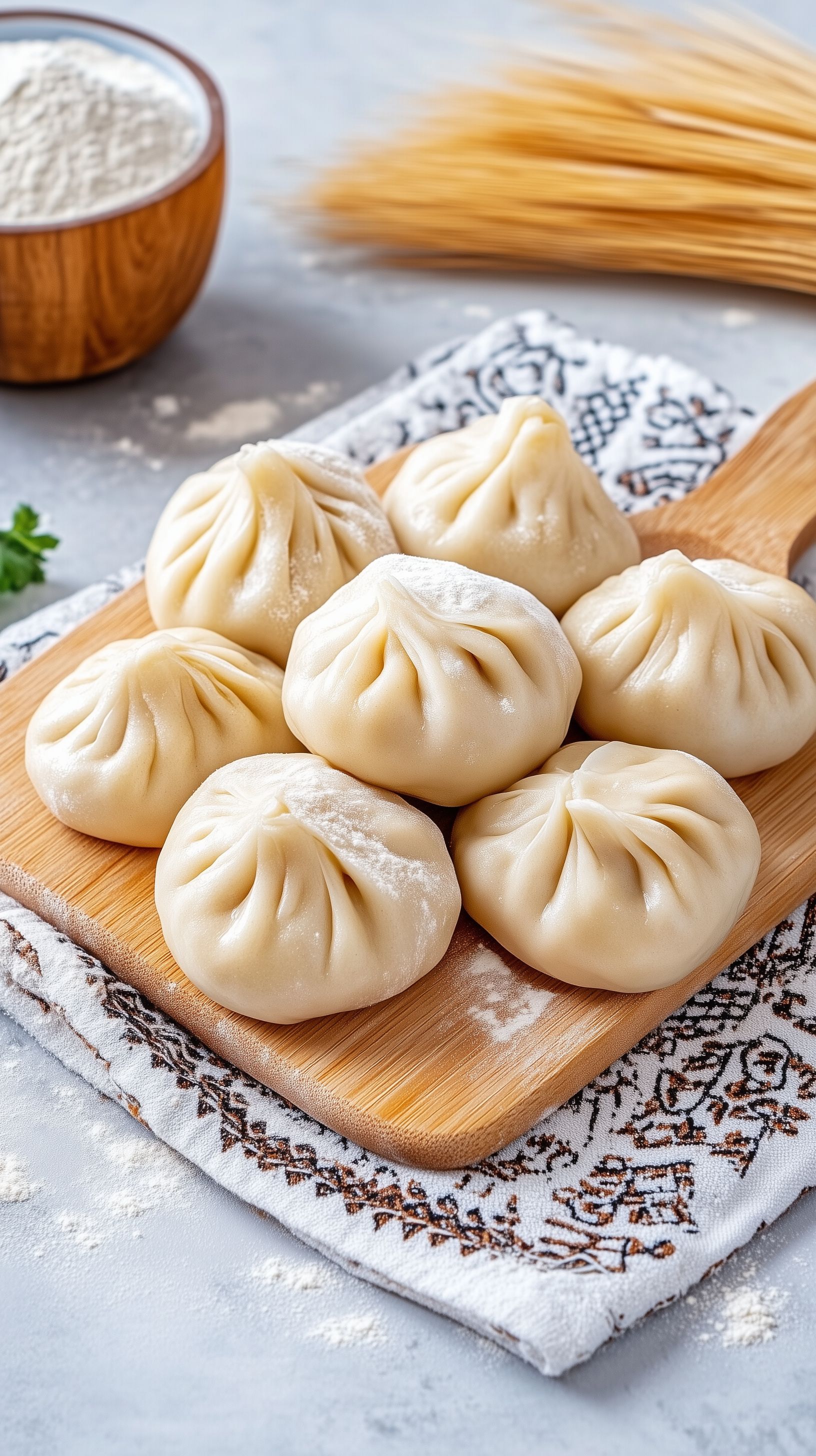 Dieses Foto zeigt eine Nahaufnahme von frisch zubereiteten Teigtaschen oder Dumplings, die auf einem hölzernen Schneidebrett angerichtet sind. Die gelblichen, gefüllten Teigtaschen sind kunstvoll arrangiert und sehen sehr appetitlich aus. Neben den Teigtaschen sind noch weitere Zutaten wie Mehl in einer Holzschale zu sehen, die auf den Herstellungsprozess hinweisen. Das Foto bietet einen detaillierten Blick auf diese traditionelle asiatische Spezialität und eignet sich hervorragend als kostenloses Stockfoto für Beiträge rund um das Thema Kochen, Gastronomie und Kulinarik in hoher Auflösung und unter der Creative-Commons-Lizenz.