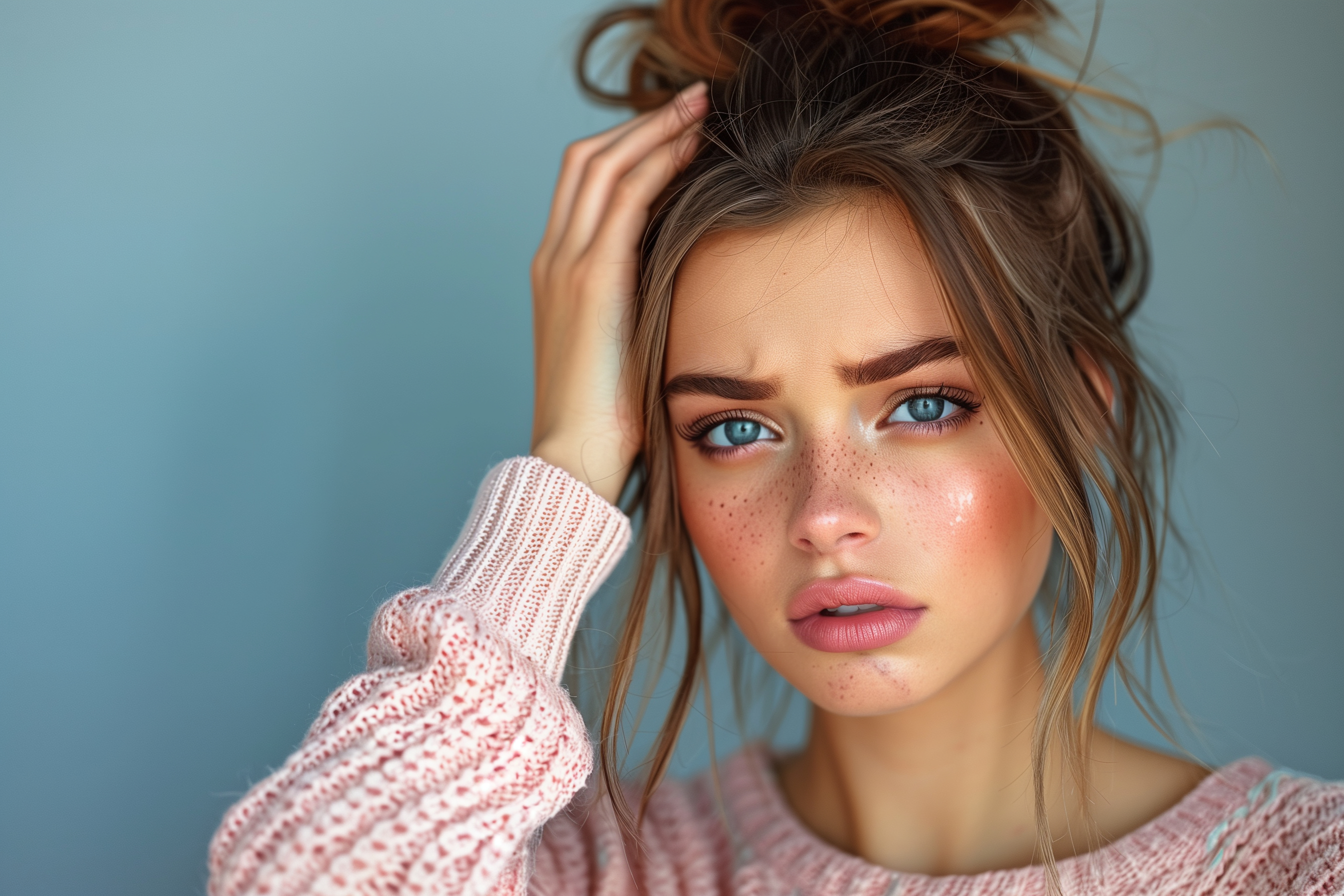 Das Bild zeigt das nachdenkliche Porträt einer jungen Frau mit braunen, lockigen Haaren und intensiven blauen Augen. Ihre Haut ist von leichten Sommersprossen überzogen, was ihr einen natürlichen und lebendigen Ausdruck verleiht. Der einfache pastellfarbene Hintergrund sorgt für eine minimalistisch-elegante Optik, die den Fokus voll und ganz auf das Gesicht der Frau lenkt.