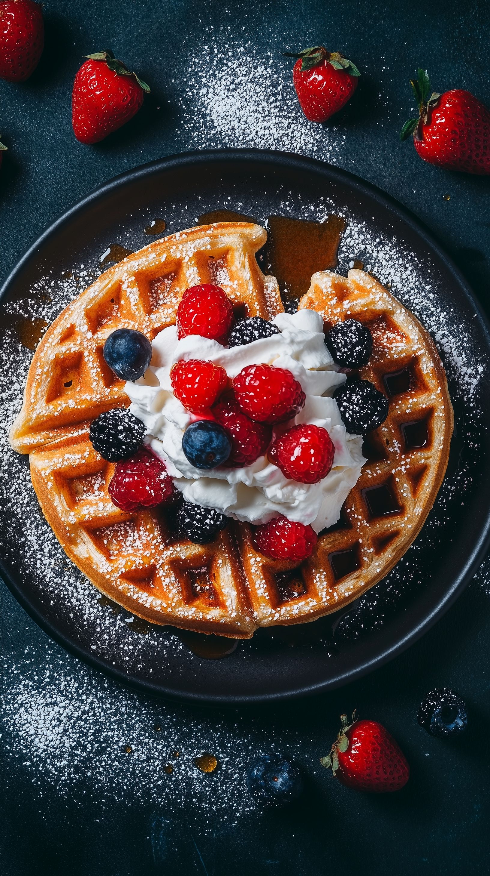 Dieses appetitliche Foto zeigt eine Platte mit knusprigen, goldbraunen Waffeln, die mit frischen roten Erdbeeren, dunkelblauen Heidelbeeren und schwarzen Brombeeren sowie einer großzügigen Portion Schlagsahne dekoriert sind. Der dunkle, strukturierte Hintergrund lässt die Farben und Texturen der Zutaten besonders eindrucksvoll zur Geltung kommen. Das Bild strahlt Gemütlichkeit und Genuss aus und eignet sich hervorragend für die Verwendung in Rezeptblog-Beiträgen, Newslettern oder Social-Media-Posts rund um Frühstück, Brunch oder Desserts. Als hochwertiges, kostenloses Stockfoto unter Creative-Commons-Lizenz ist es vielfältig einsetzbar.