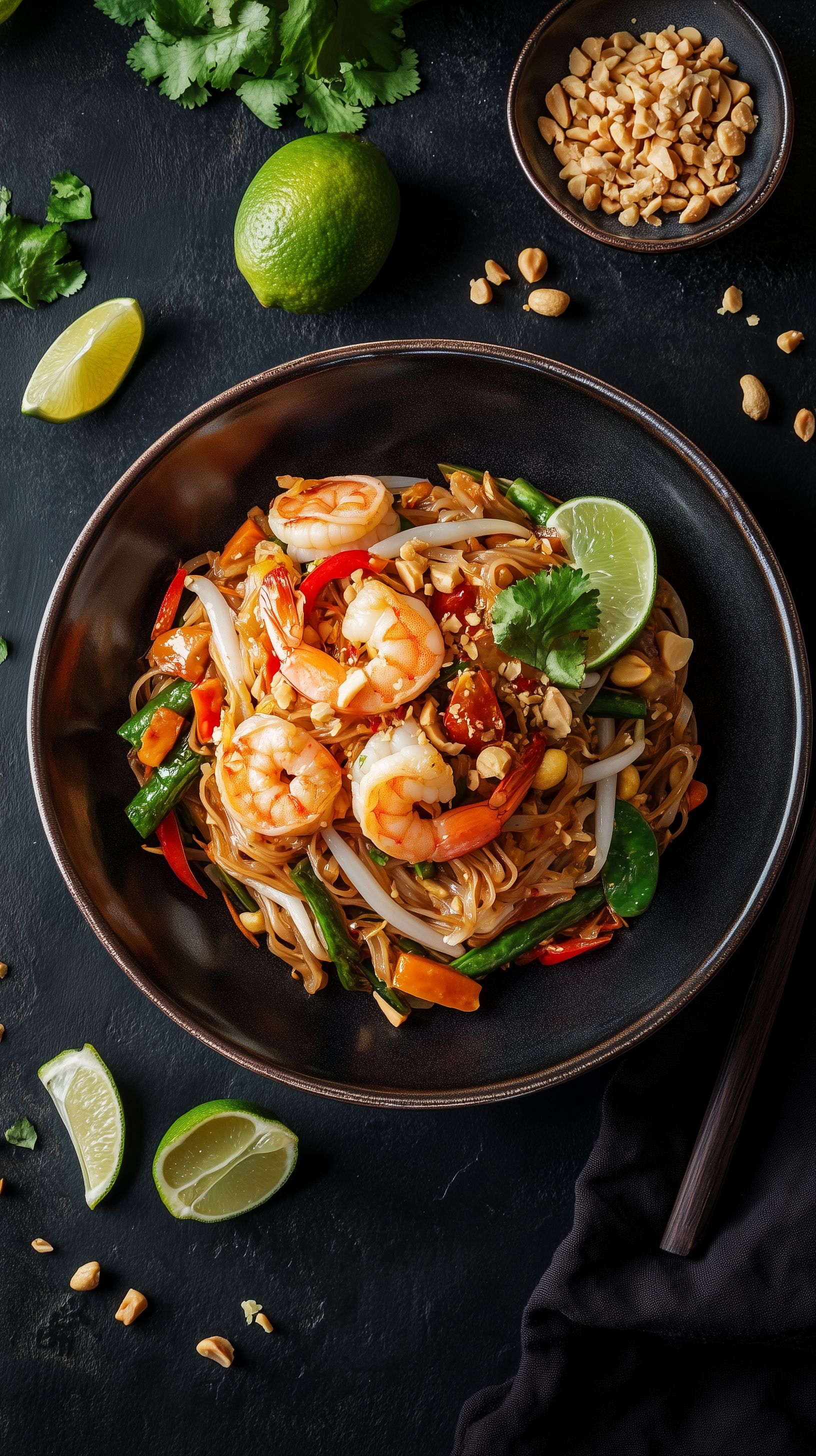 Dieses authentische Pad Thai-Gericht mit knackigen Garnelen und aromatischer Limette ist ein echter Blickfang. Die dampfenden Reisnudeln, die bunten Gemüsestücke und die goldbraunen Erdnüsse schaffen eine appetitliche Komposition auf dunklem Untergrund. Das Foto eignet sich hervorragend als hochwertiges Stockfoto für Foodblog-Beiträge, Social-Media-Postings oder Werbeanzeigen in der Gastronomie. Mit einer Auflösung von 4K und einer Creative-Commons-Lizenz ist das Bild kostenfrei und vielseitig einsetzbar.