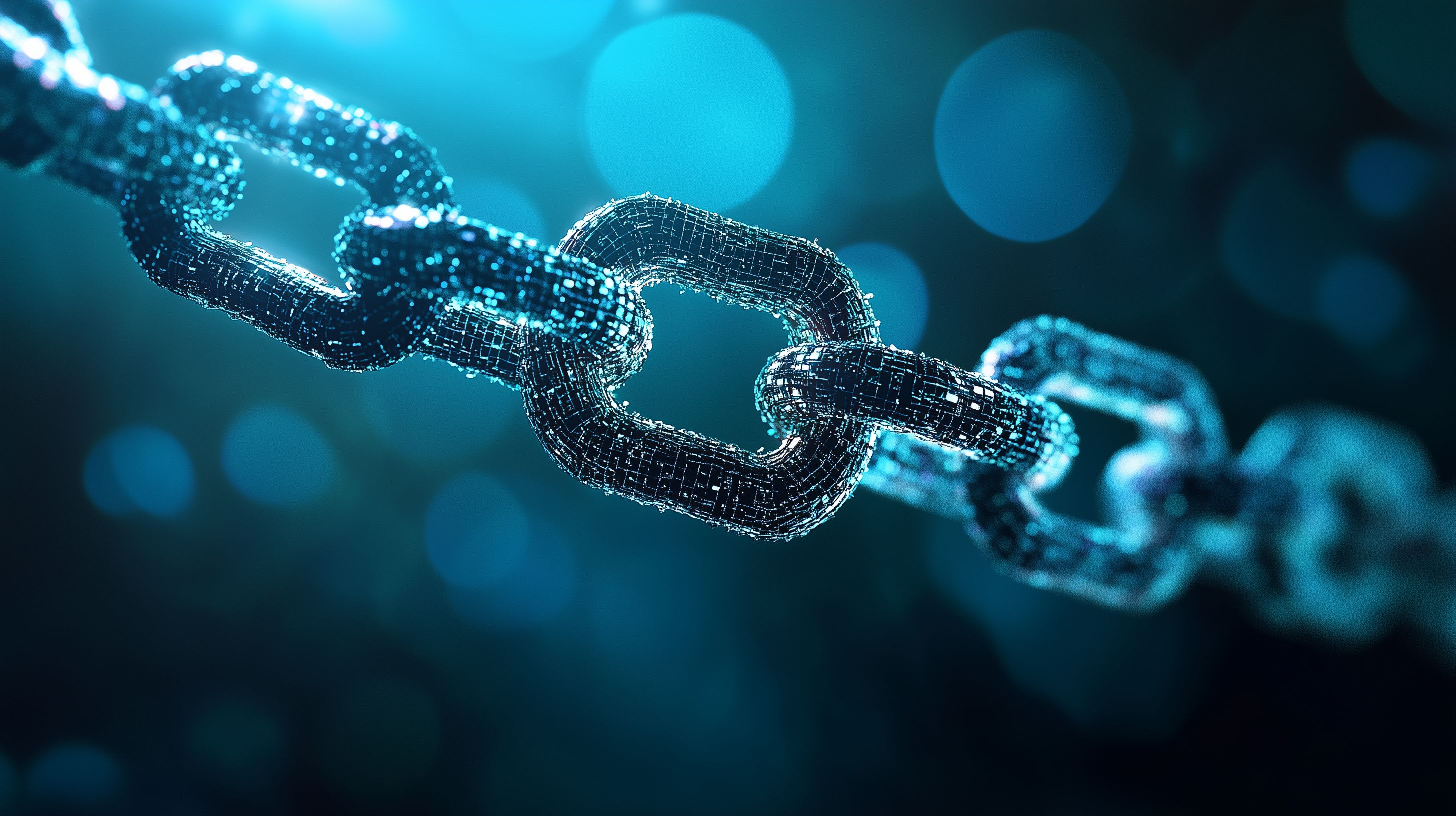 Das Bild zeigt eine beeindruckende, schillernde digitale Blockchain-Verbindung. Zu sehen sind mehrere glänzende, vernetzte Ketten in einem tiefblauen Farbspiel mit leuchtenden Lichtern. Die Komposition wirkt futuristisch und hochmodern, fast wie ein Ausschnitt aus einer Science-Fiction-Szene. Diese dynamische und abstrakte Darstellung eignet sich hervorragend als Hintergrund oder visuelle Ergänzung für Themen rund um Digitalisierung, Technologie, Cyber-Sicherheit und Innovationen. Als kostenloses Stockfoto in hoher Auflösung und unter der Creative-Commons-Lizenz kann es vielfältig in Blogbeiträgen, Newslettern, Social-Media-Posts oder Werbekampagnen eingesetzt werden.