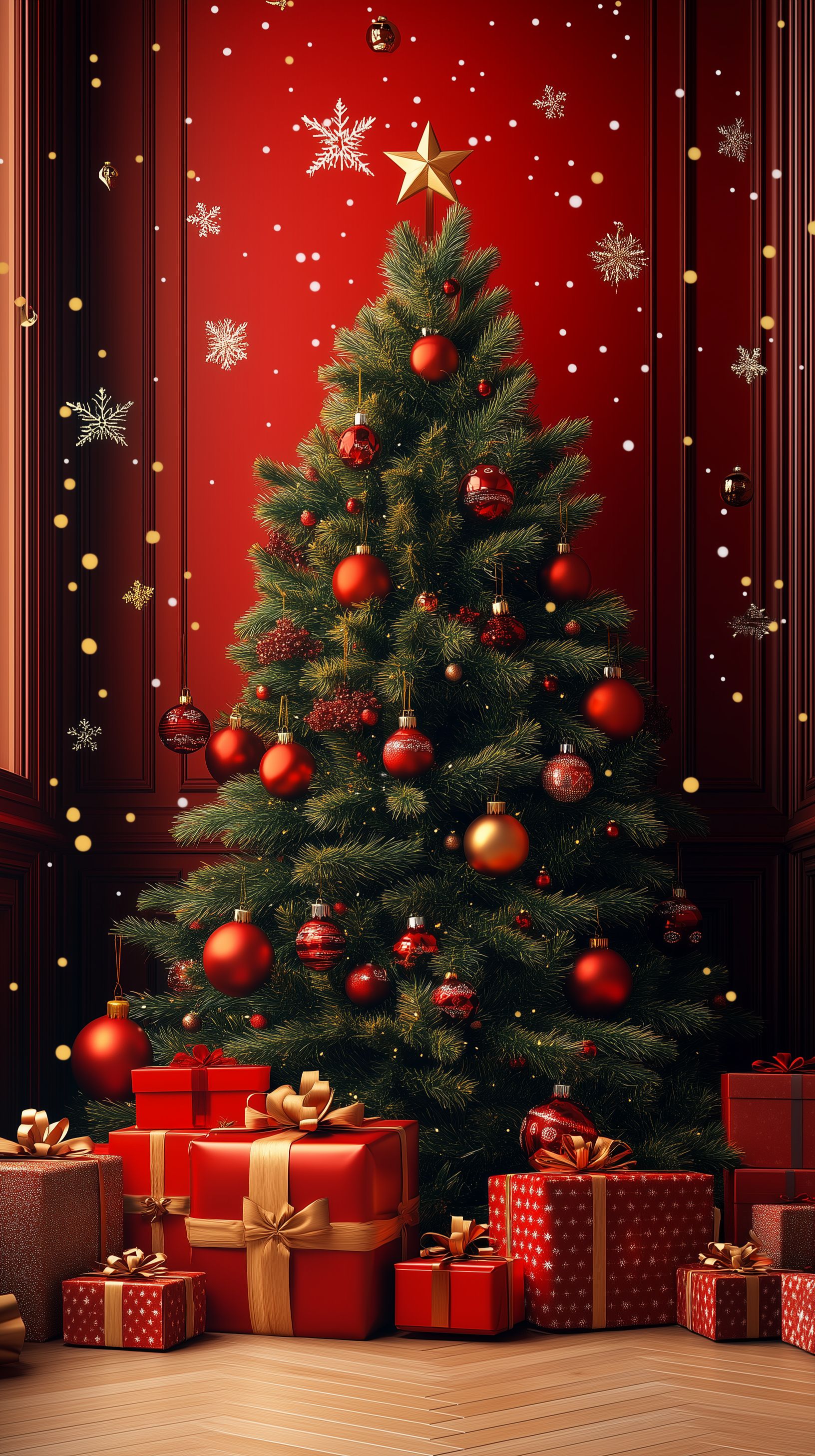 Das Bild zeigt einen festlich geschmückten Weihnachtsbaum, der vor einem roten Hintergrund steht. Der Baum ist mit bunten Weihnachtskugeln, Lichterketten und einem goldenen Stern an der Spitze dekoriert. Darunter befinden sich zahlreiche Geschenke in verschiedenen Verpackungen. Die Szene strahlt eine weihnachtliche, gemütliche Atmosphäre aus und ist ideal für die Verwendung in Weihnachtsdekorationen, Grußkarten, Blogbeiträgen oder Werbekampagnen rund um die Feiertage. Dieses hochauflösende Stockfoto ist unter der Creative-Commons-Lizenz kostenfrei nutzbar.