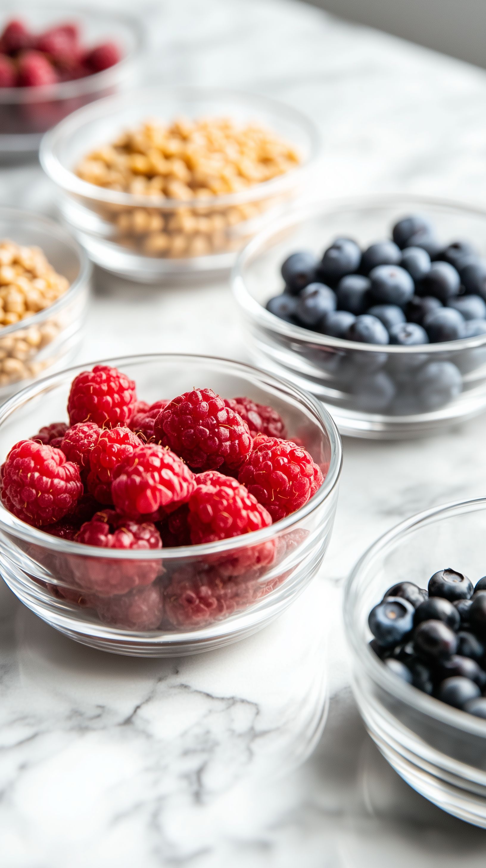 Dieses Bild zeigt eine Auswahl verschiedener Beerenfrüchte und Nüsse, die in Glasschalen auf einem Marmortisch präsentiert werden. Die roten Himbeeren und dunkelblauen Blaubeeren stechen farblich hervor und machen das Bild sehr appetitlich. Die Nüsse ergänzen das Arrangement und verleihen dem Bild zusätzliche Textur. Die Aufsicht-Perspektive und der schlichte Marmortisch-Hintergrund schaffen eine ruhige, hochwertige Ästhetik, die sich gut für die Verwendung in Blogbeiträgen, Newslettern oder Social-Media-Posts zu den Themen Ernährung, Gesundheit oder Lebensstil eignet. Dieses hochauflösende Stockfoto steht unter einer Creative-Commons-Lizenz zur kostenlosen Verwendung zur Verfügung.