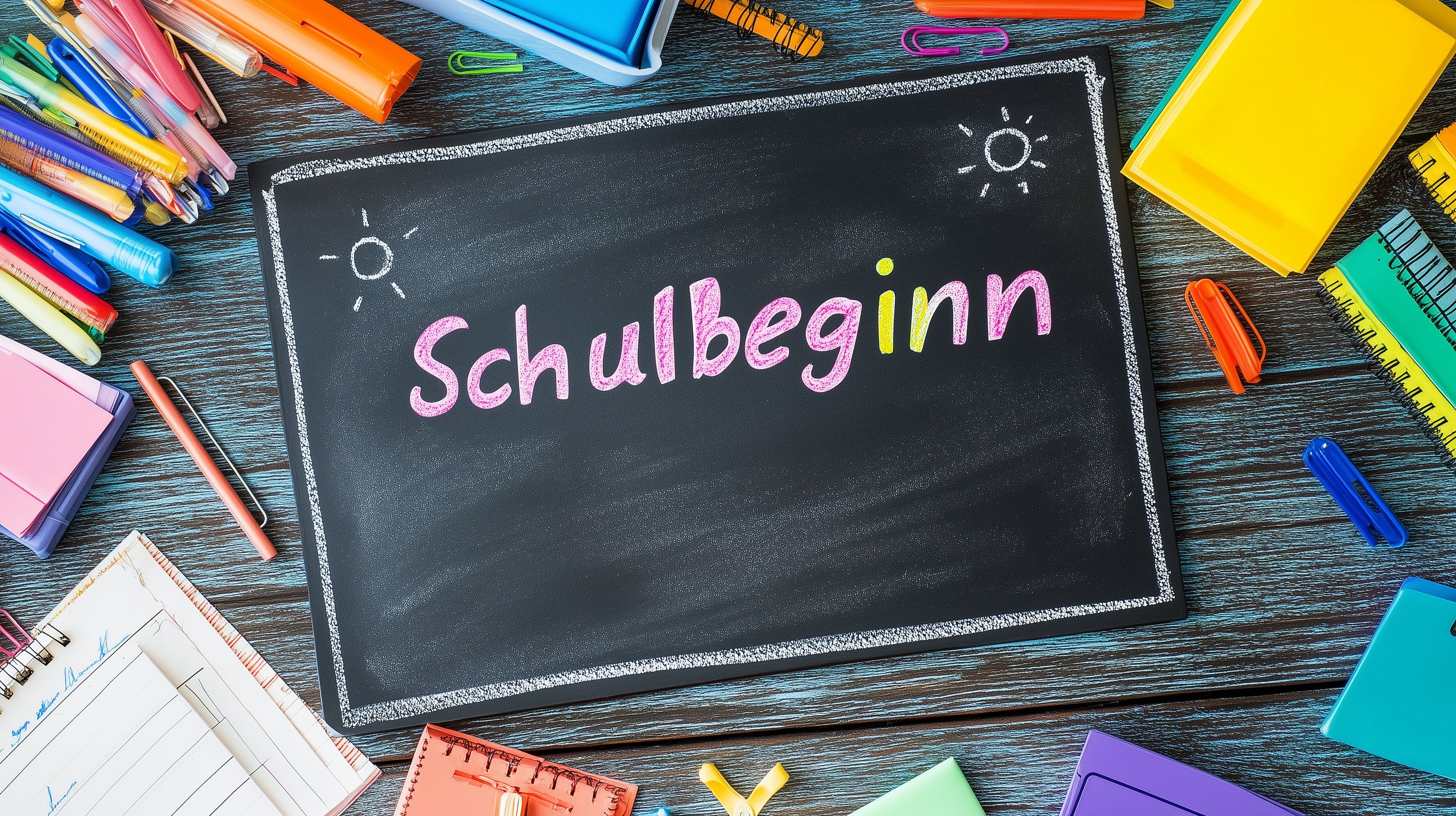Dieses Foto zeigt eine Vielzahl von bunten und kreativen Schulmaterialien vor einer Tafel. Im Zentrum befindet sich eine Kreidetafel mit der Aufschrift 'Schulbeginn' in rosa Kreide. Rings herum sind Stifte, Marker, Lineal und andere Utensilien in verschiedenen Farben wie Blau, Gelb, Orange und Lila angeordnet. Das Bild vermittelt eine fröhliche und inspirierende Stimmung für den Start ins neue Schuljahr.