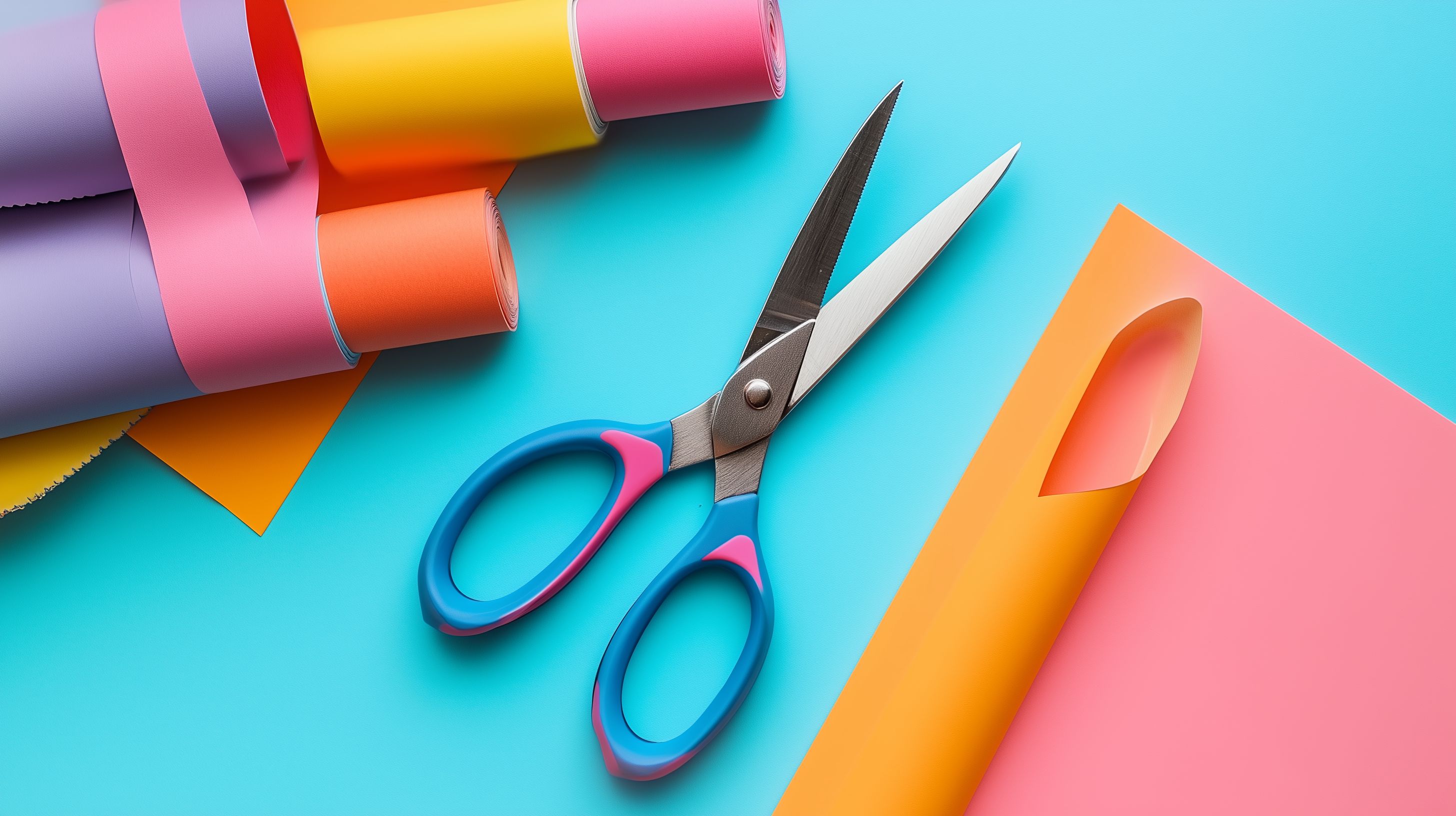 Dieses Foto zeigt eine Auswahl an bunten Bastelmaterialien auf einem türkisfarbenen Hintergrund. Im Vordergrund befinden sich eine Schere und einige Rollen farbigen Papiers in verschiedenen Tönen von Rosa, Rot, Gelb und Orange. Diese Elemente eignen sich hervorragend als Hintergründe für kreative DIY-Projekte, Werbe- und Marketingmaterial oder als stimmungsvolle Illustrationen in Blogs und Newslettern. Das hochaufgelöste, kostenlose Stockfoto steht unter der Creative-Commons-Lizenz zur Verfügung und kann für eine Vielzahl von Zwecken genutzt werden.