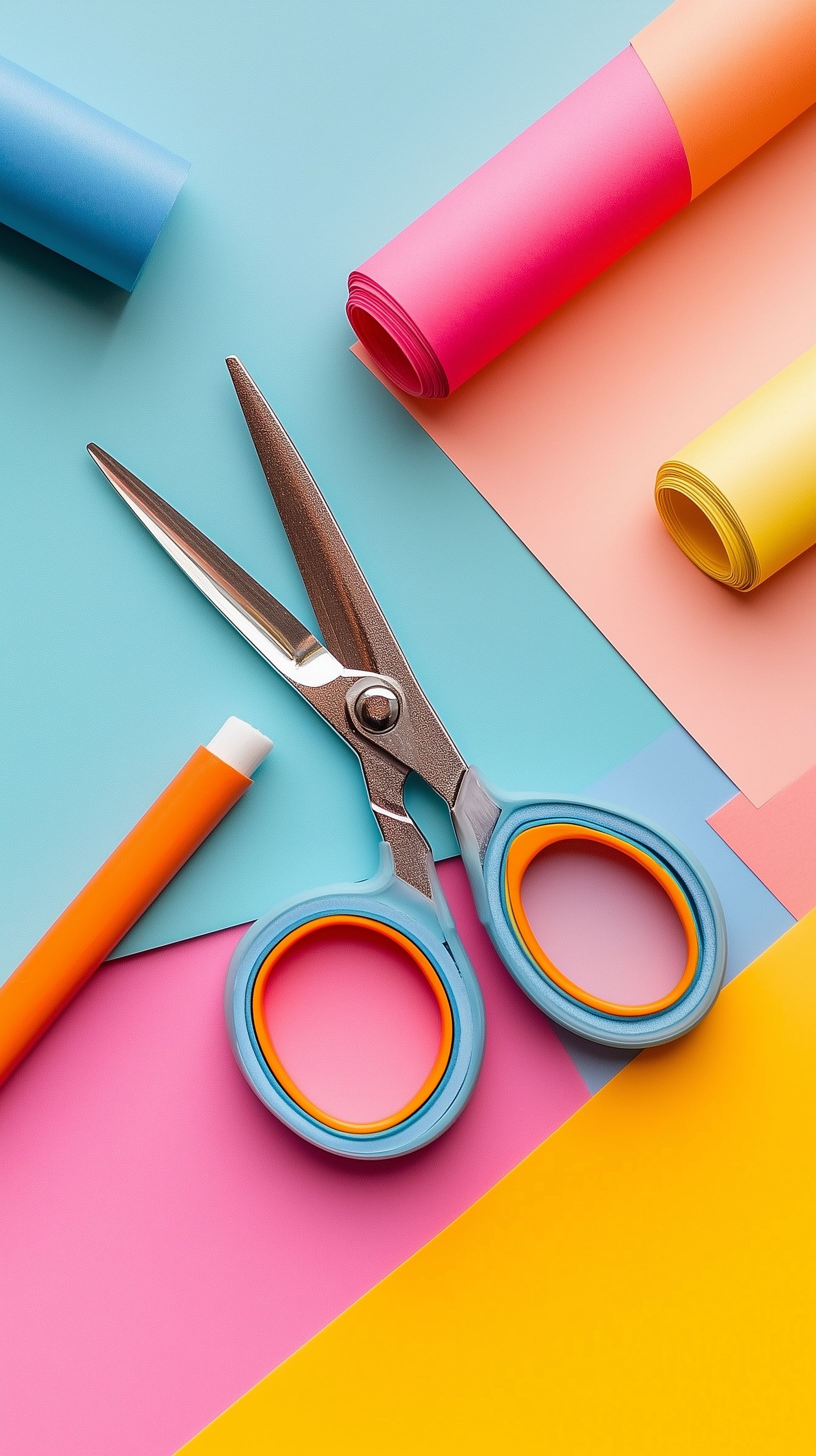 Das Bild zeigt eine Komposition aus bunten Bastelutensilien auf einem pastellfarbenen Hintergrund. Im Vordergrund liegen eine Schere sowie mehrere Rollen farbiges Papier in leuchtendem Rosa, Orange und Gelb. Der Hintergrund ist in einem hellen, beruhigenden Blauton gehalten, der den Fokus auf die kreativen Materialien lenkt. Die Anordnung der Elemente wirkt ausgewogen und minimalistisch, was eine ästhetisch ansprechende, inspirirende Stimmung vermittelt. Dieses kostenlose Stockfoto in hoher Auflösung unter Creative-Commons-Lizenz eignet sich hervorragend für Blogs, Newsletter, Social-Media-Posts oder Werbemotive rund um Kreativität, DIY-Projekte und Handwerksthemen.