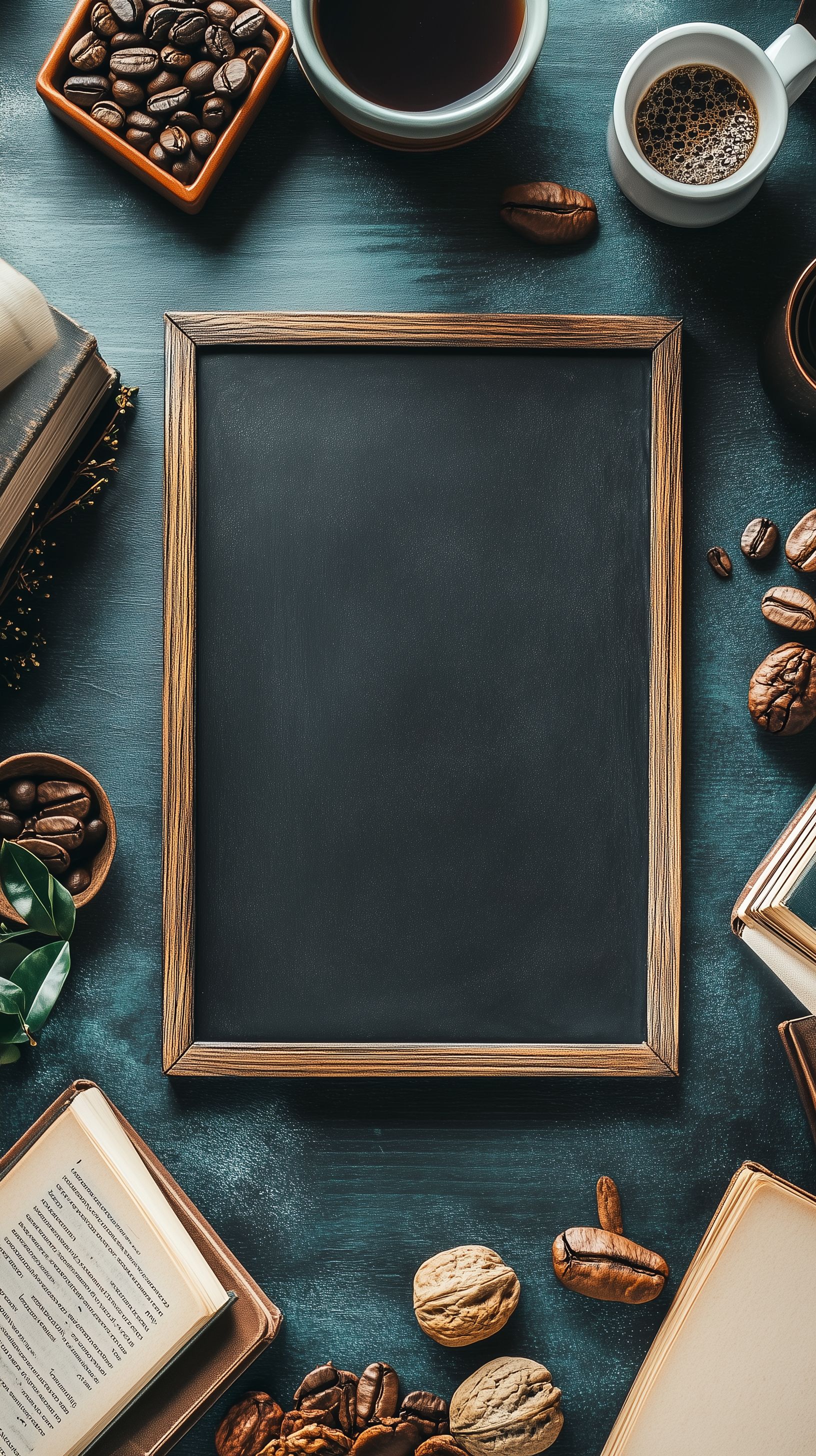 Dieses Foto zeigt ein stimmungsvolles Stillleben mit einer Tasse Kaffee, einer Schale voller Kaffeebohnen und verschiedenen Nüssen, umrahmt von einer dunklen Tafel auf einem grünen Hintergrund. Die Komposition spielt mit den Kontrasten von warm und kalt, hell und dunkel, glatt und rau. Das Bild vermittelt eine gemütliche, rustikale Atmosphäre und eignet sich hervorragend für den Einsatz in Blogs, Newslettern, Social-Media-Beiträgen oder Werbematerialien rund um das Thema Kaffee und gemütliche Genussmomente. Dieses kostenlose Stockfoto in hoher Auflösung steht unter einer Creative-Commons-Lizenz zur Verfügung.