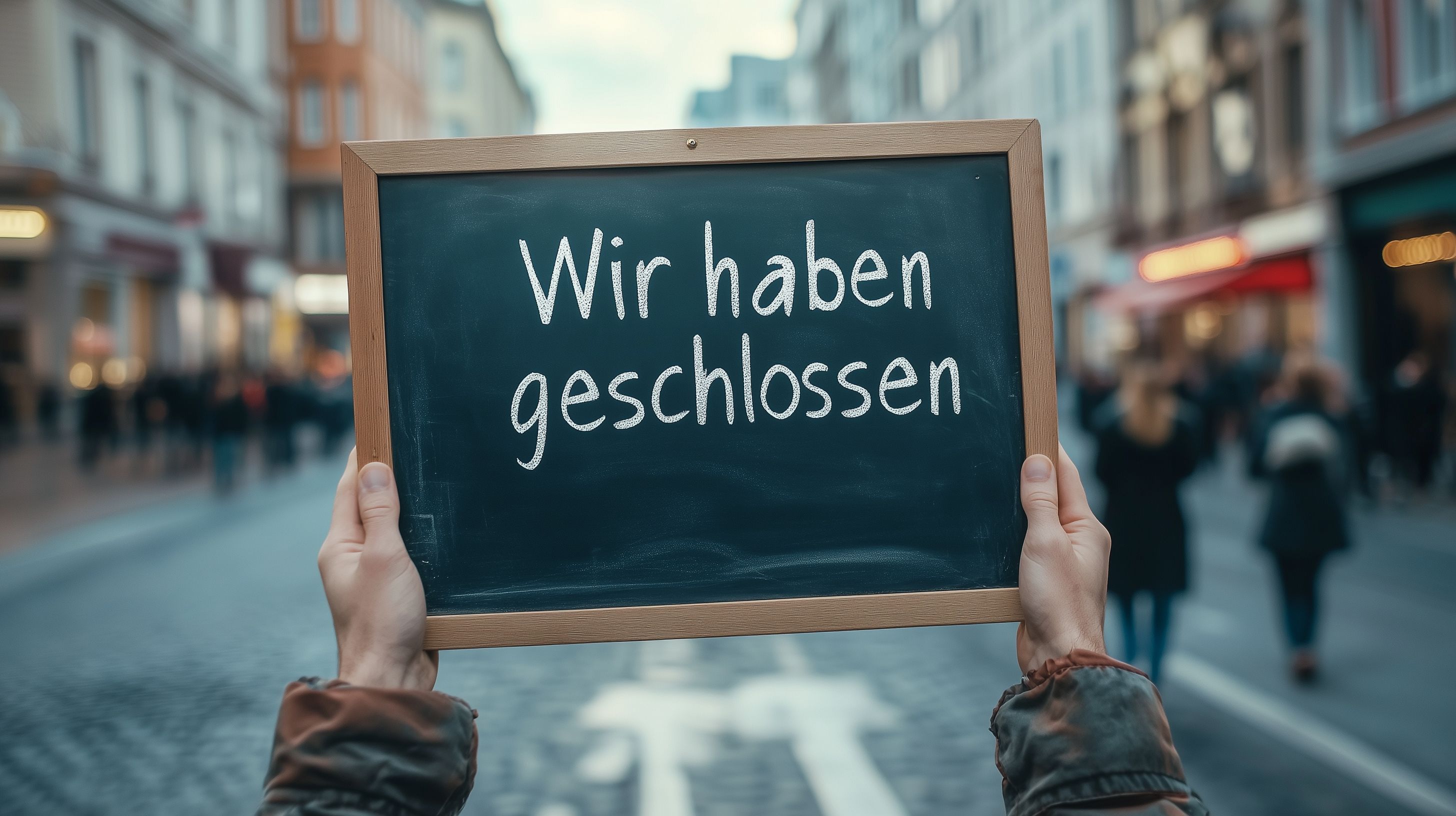 Schild mit der Aufschrift 'Wir haben geschlossen' in belebter Straße von Marco Verch unter Creative Commons 2.0