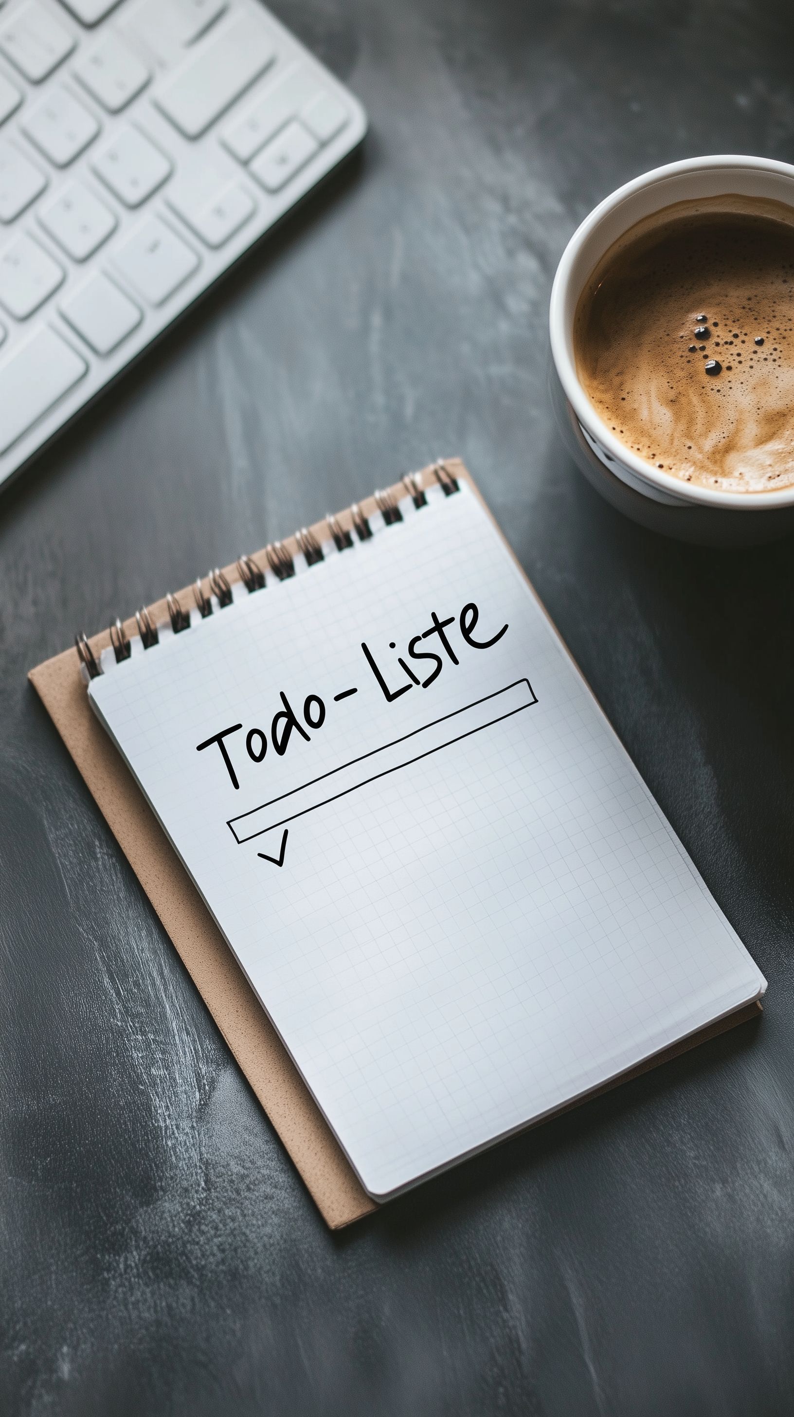 Das Bild zeigt einen minimalistischen Büroarbeitsplatz mit einer handgeschriebenen To-Do-Liste auf einem Spiralblock, einer Tastatur und einer Tasse Kaffee. Der dunkle, kontraststarke Hintergrund lenkt den Blick gezielt auf die wesentlichen Elemente des Arbeitsplatzes. Diese Szene vermittelt Fokussierung, Produktivität und Zeitmanagement, aber auch kreative Freiheit und Entspannung während der Arbeit. Das Foto eignet sich hervorragend als kostenloses Stockfoto für Blog-Beiträge, Newsletter, Social-Media-Posts oder Werbematerial in hoher Auflösung und unter der Creative-Commons-Lizenz.