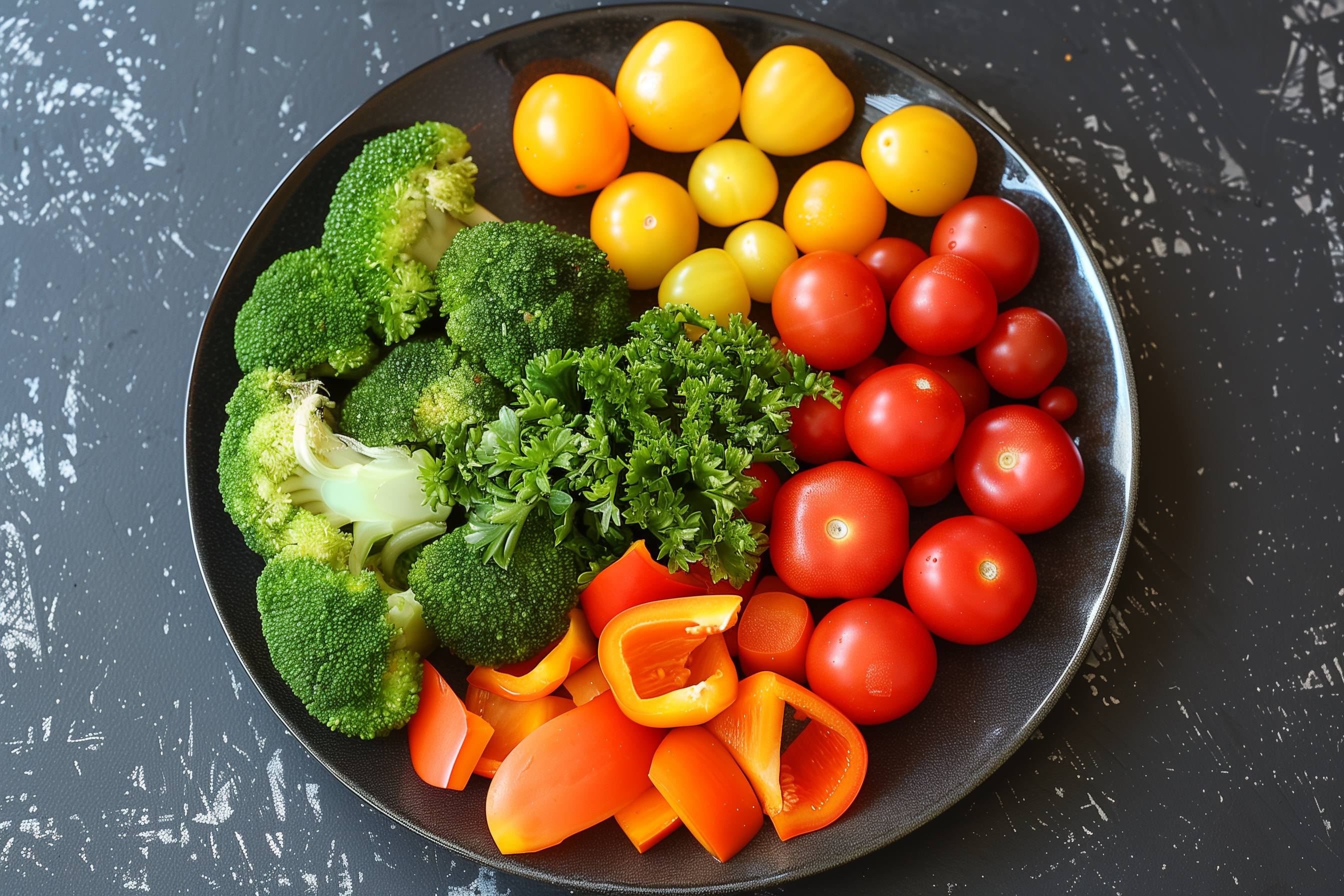 Das Foto zeigt eine vielfältige Auswahl an frischem Obst und Gemüse auf einem schwarzen Teller. Es ist eine übersichtliche, farbenfrohe Anordnung mit leuchtend roten Tomaten, orangenen Paprikastücken und grünen Brokkoli-Röschen sowie gelben Zitronen und Petersilie. Das Bild hat eine klare, natürliche Ästhetik und eignet sich perfekt als kostenloses Stockfoto für Blogs, Newsletter, Werbung oder Social-Media-Kanäle zum Thema gesunde Ernährung, Vegetarismus, Veganismus oder Diät. Die hochauflösende Qualität und Creative-Commons-Lizenz machen es vielseitig einsetzbar.