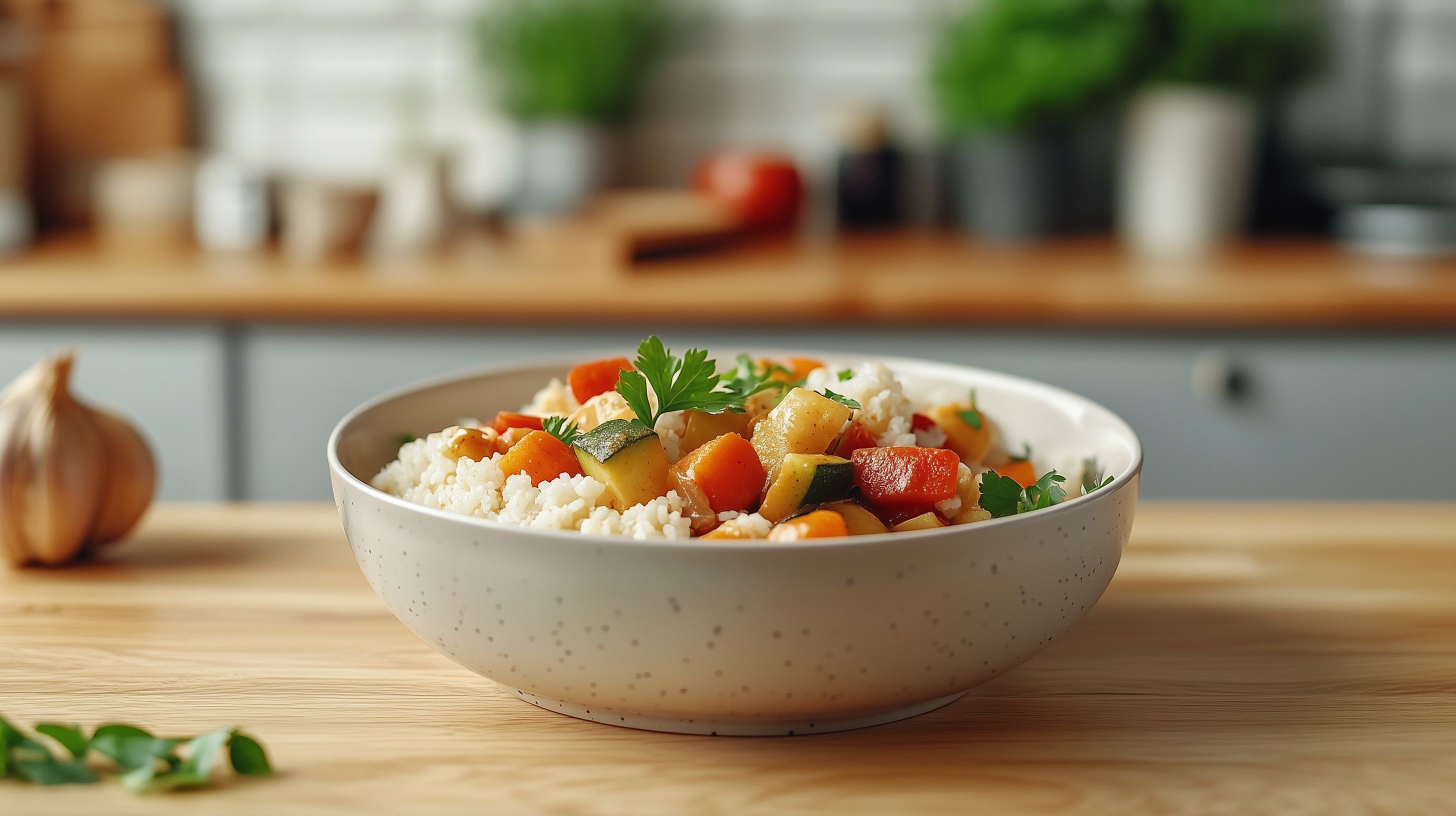 Dieses Foto zeigt ein leckeres Gemüsecurry mit Couscous, serviert in einer rustikalen Schüssel auf einem hölzernen Tisch. Die Schüssel ist mit bunten Gemüsestücken gefüllt, die in einer leicht cremigen Sauce schwimmen. Neben der Schüssel sind weitere Zutaten wie Knoblauch und Kräuter zu sehen, die die natürliche und frische Optik des Gerichts unterstreichen. Das Foto ist perfekt für die Verwendung in Kochrezepten, Lifestyle-Artikeln oder Werbematerial für gesunde und leckere Mahlzeiten. Es bietet eine hochauflösende, lizenzfreie Darstellung eines appetitlichen vegetarischen Gerichts in einem stimmungsvollen, rustikalen Ambiente.