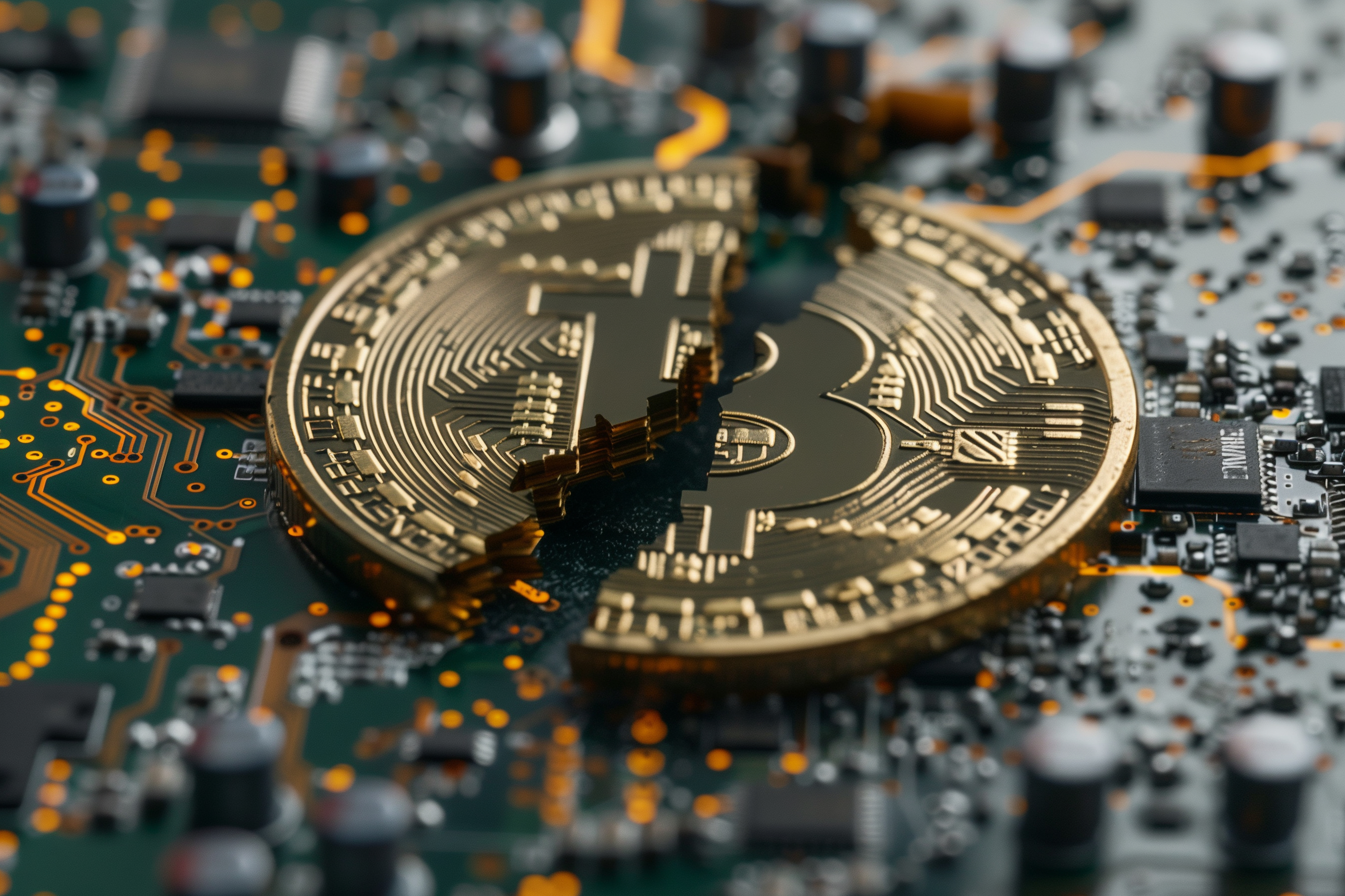 Das Foto zeigt eine Nahaufnahme einer Bitcoin-Münze, die auf einer grünen Computerplatine liegt. Die Münze ist detailreich dargestellt und die Oberflächenstruktur des Metalls ist deutlich erkennbar. Die Platine im Hintergrund ist ebenfalls scharf abgebildet und zeigt verschiedene elektronische Komponenten und Leiterbahnen.