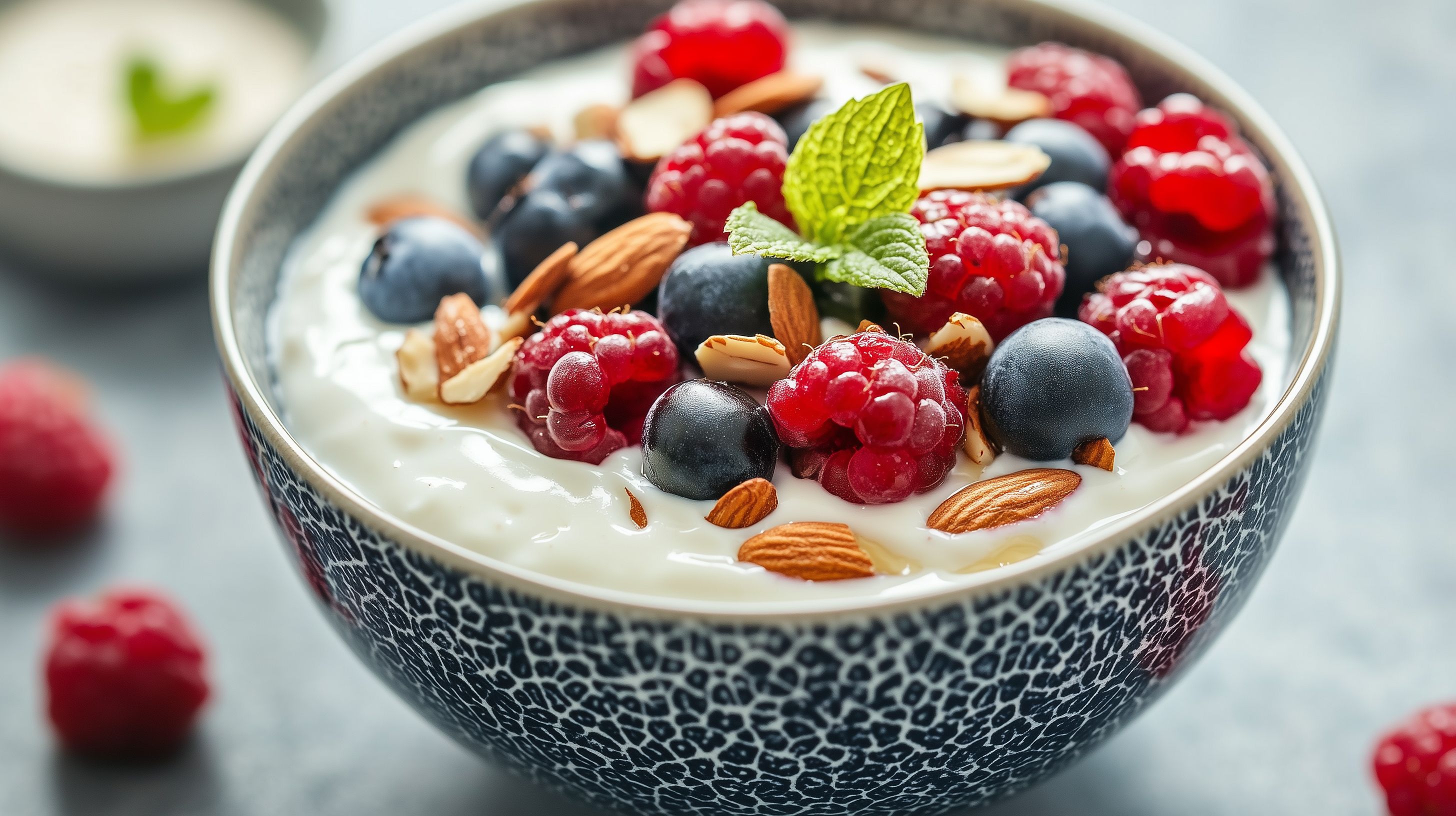 Das Bild zeigt eine schöne Nahaufnahme einer Schüssel mit cremigem Joghurt, der mit frischen roten Himbeeren, dunkelvioletten Heidelbeeren und gerösteten Mandeln garniert ist. Das Arrangement ist farblich ausgewogen und schafft eine appetitliche, natürliche Optik. Das Foto eignet sich hervorragend für den Einsatz in Blogs, Newslettern, Social-Media-Beiträgen oder Werbematerialien zum Thema gesunde Ernährung, Frühstücksideen oder Desserts. Als kostenloses Stockfoto in hoher Auflösung und unter Creative-Commons-Lizenz ist es frei nutzbar.