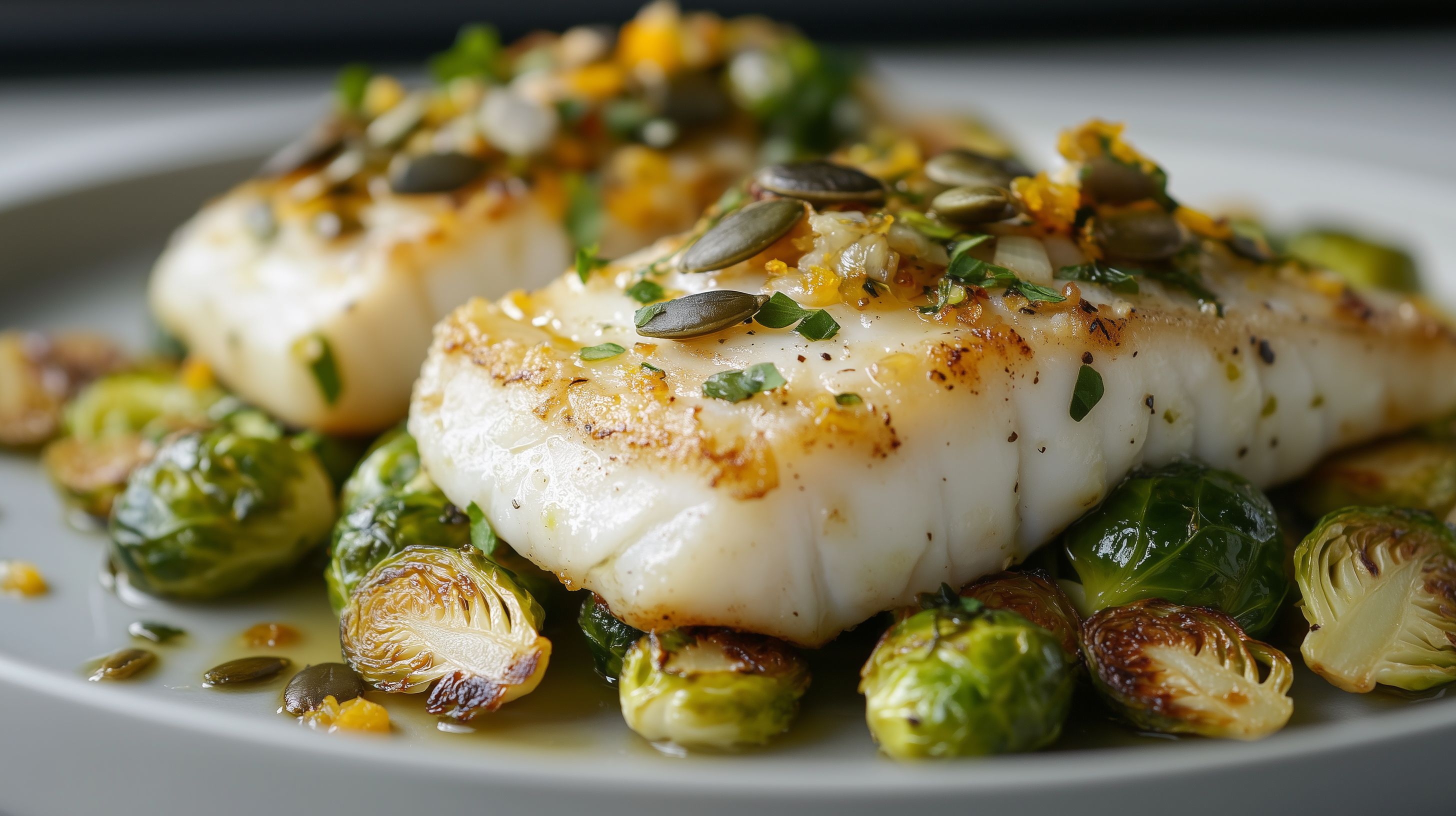 Dieses appetitliche Foto zeigt ein leckeres Fischgericht mit knusprig gebratenem Kabeljau, der von gerösteten Rosenkohl-Kernen und frischem Gemüse umgeben ist. Die Komposition besticht durch die stimmige Farbgebung in Gelb-, Grün- und Weißtönen sowie die perfekte Anrichtung auf dem Teller. Das Foto eignet sich hervorragend für den Einsatz in Kochblogs, Rezeptsammlungen oder als hochwertiges Werbefoto für Lebensmittel- und Gastronomie-Anbieter. Als kostenloses, hochauflösendes Stockfoto unter Creative-Commons-Lizenz ist es frei nutzbar.