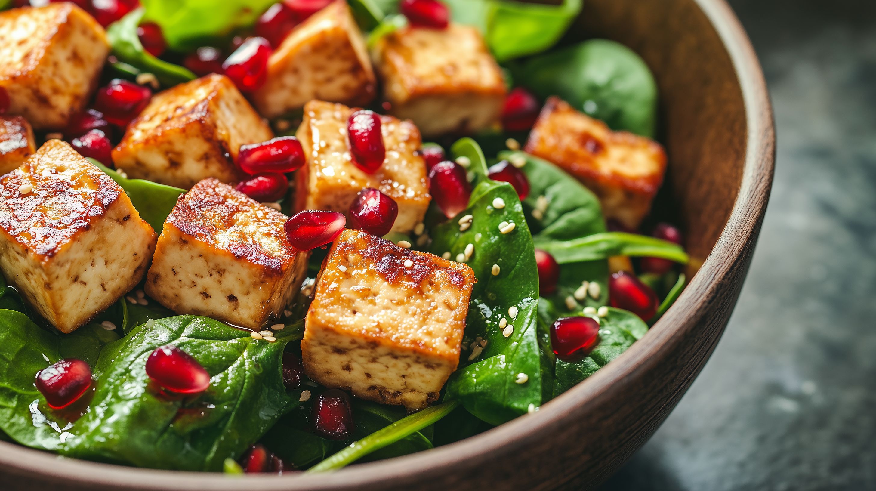 Dieses appetitliche Foto zeigt eine Schüssel mit einem leckeren Tofu-Spinat-Salat. Der Salat ist mit knusprig gebratenen Tofuwürfeln, frischen Spinatblättern und knackigen Granatapfelkernen angerichtet. Die Zutaten verleihen dem Gericht eine gesunde, farbenfrohe Optik und machen es zu einem echten Powerfood. Die rustikale Holzschüssel verleiht dem Bild eine natürliche, einladende Atmosphäre. Dieses hochauflösende Foto eignet sich hervorragend für den Einsatz in Blogs, Newslettern, Social-Media-Postings oder Werbekampagnen rund um gesunde, vegane Ernährung. Das Bild steht unter einer Creative-Commons-Lizenz zum kostenlosen Download zur Verfügung.