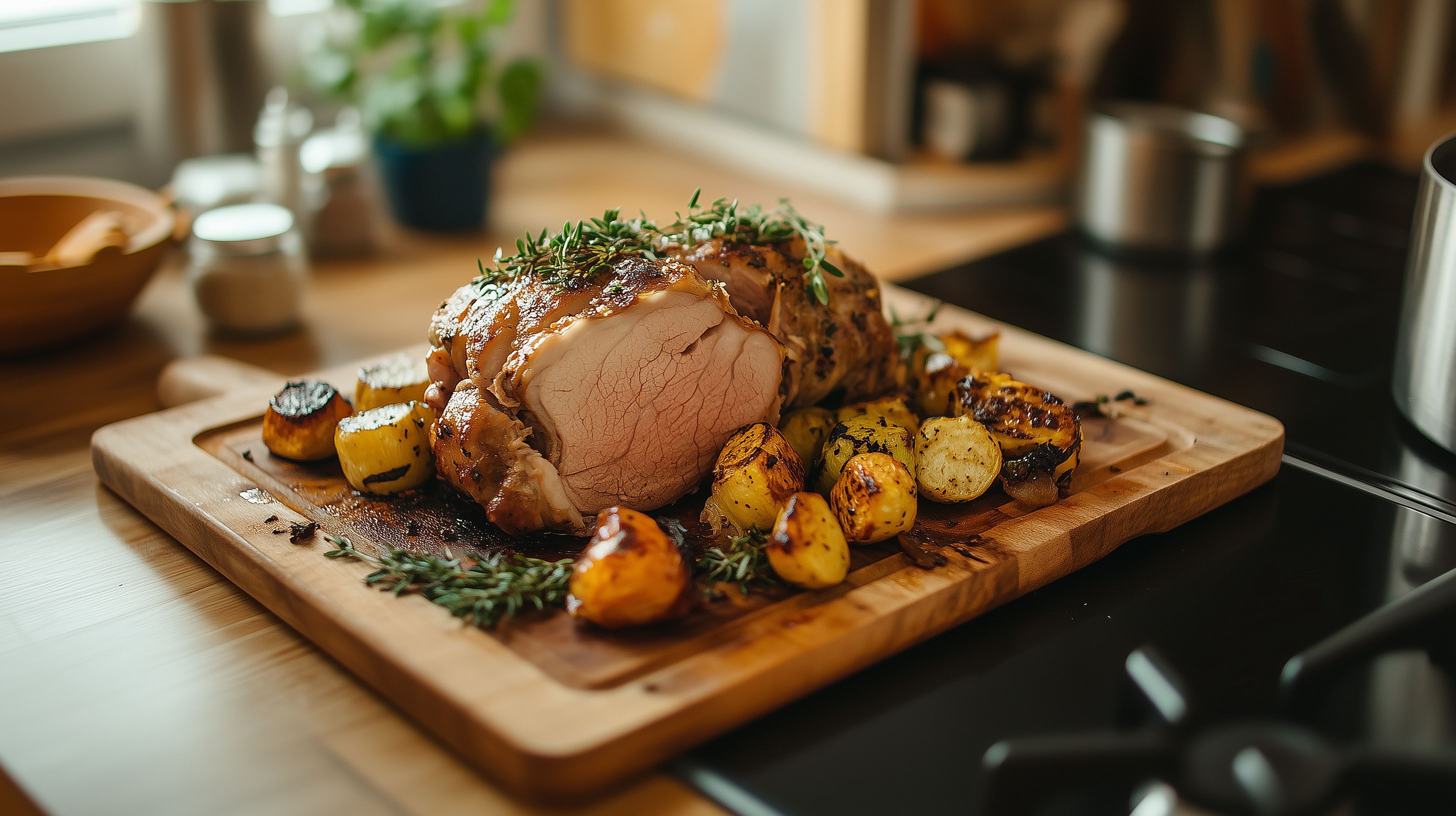 Dieses Foto zeigt einen köstlichen Schweinebraten, der auf einem rustikalen Holzbrett präsentiert wird. Der Braten ist goldbraun gegart und mit knusprigen Kartoffeln und frischen Kräutern garniert. Die Komposition und Beleuchtung schaffen eine appetitliche, natürliche Stimmung, die perfekt für Rezept-Blogs, Kochbücher oder gastronomische Werbung geeignet wäre. Als hochauflösendes, kostenloses Stockfoto unter Creative Commons-Lizenz ist es vielseitig einsetzbar.