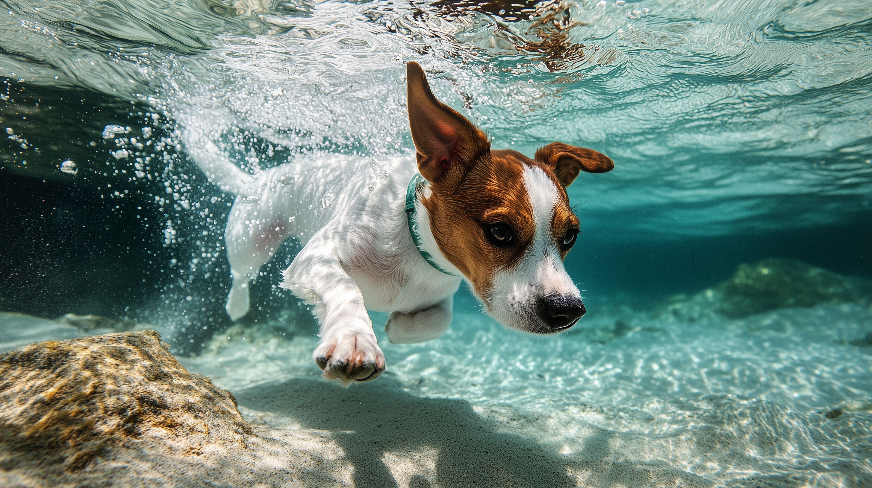 Dieses farbenfrohe Bild zeigt einen Hund, der schwimmend und spielerisch nach einem Objekt unter Wasser greift. Die klaren, smaragdfarbenen Fluten und die sichtbaren Wasserblasen verleihen dem Motiv eine dynamische, erfrischende Atmosphäre. Der Hund, vermutlich ein Jack Russell Terrier, ist in Bewegung erfasst und verleiht dem Foto eine lebendige, natürliche Note.
