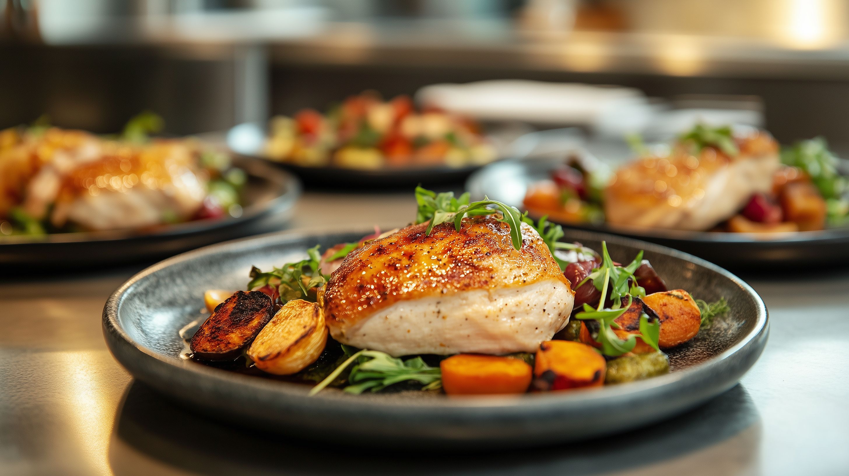 Das Bild zeigt ein köstlich zubereitetes Hähnchengericht mit einer Beilage aus Ofengemüse wie Kartoffeln, Möhren und Zwiebeln. Das saftige Hähnchenfleisch ist goldbräunlich gegrillt und auf einem rustikalen Teller angerichtet, umgeben von einem frischen Salat mit Kräutern. Die Farbkomposition aus Braun, Orange und Grün schafft eine appetitliche und harmonische Atmosphäre. Dieses Foto eignet sich perfekt für die Verwendung in Onlineshops, Restaurantwebsites, Foodblogs oder Werbematerialien für Catering-Services. Als hochauflösendes Stockfoto unter Creative-Commons-Lizenz ist es kostenfrei nutzbar.