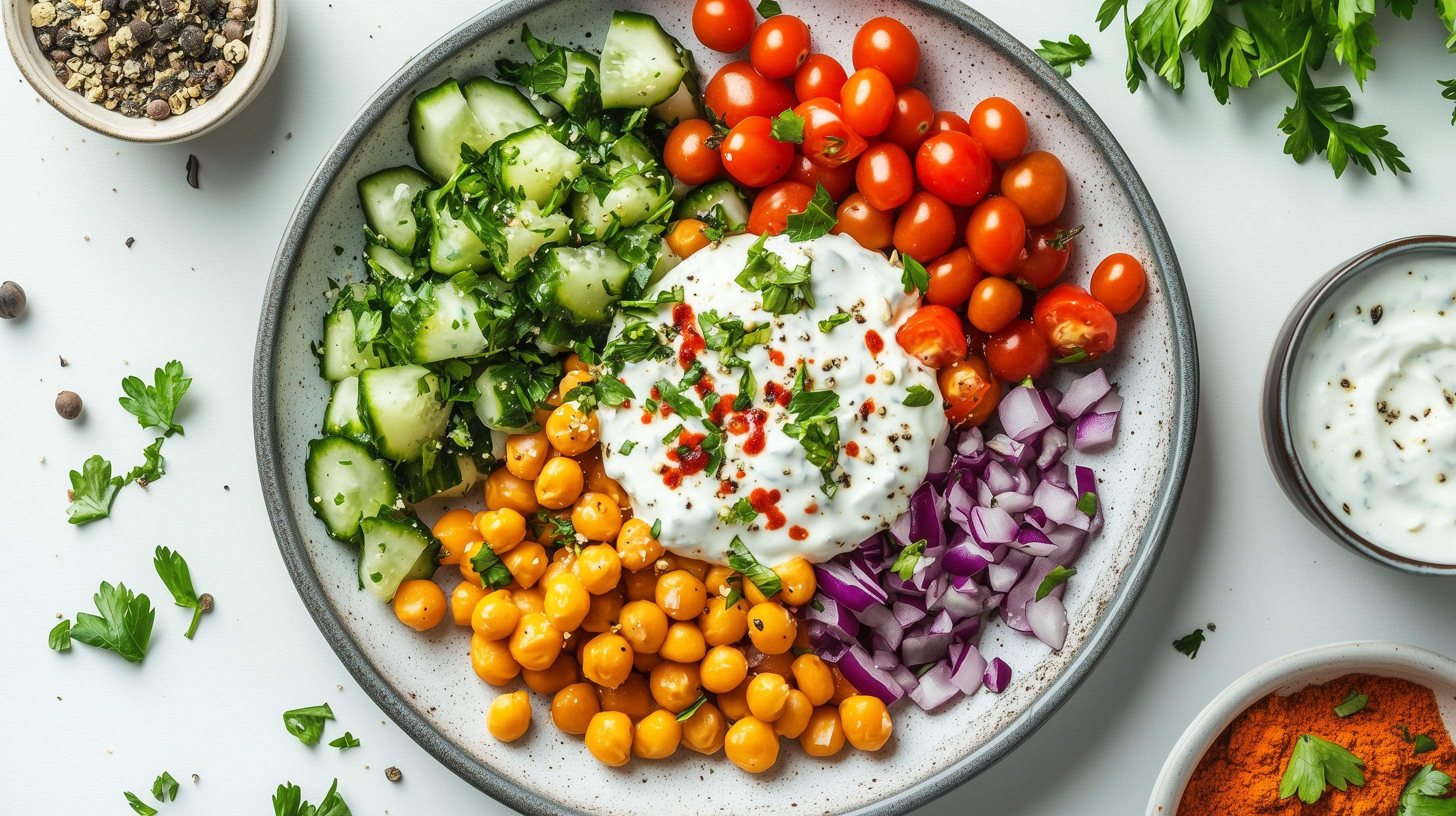 Dieses Bild zeigt einen abwechslungsreichen Salatteller mit frischen Zutaten wie Gurken, Tomaten, Kichererbsen, Zwiebeln und einer Vielzahl an Kräutern. Das Gericht ist in einer rustikalen Schüssel angerichtet und mit einem cremigen Joghurt-Dressing versehen. Die Farbpalette aus Grün, Rot, Orange und Lila ergibt eine appetitliche und ausgewogene Optik. Dieses Foto eignet sich hervorragend für Rezeptbeiträge, Ernährungsratgeber oder Werbung für gesunde Ernährung in hoher Auflösung und unter Creative-Commons-Lizenz.
