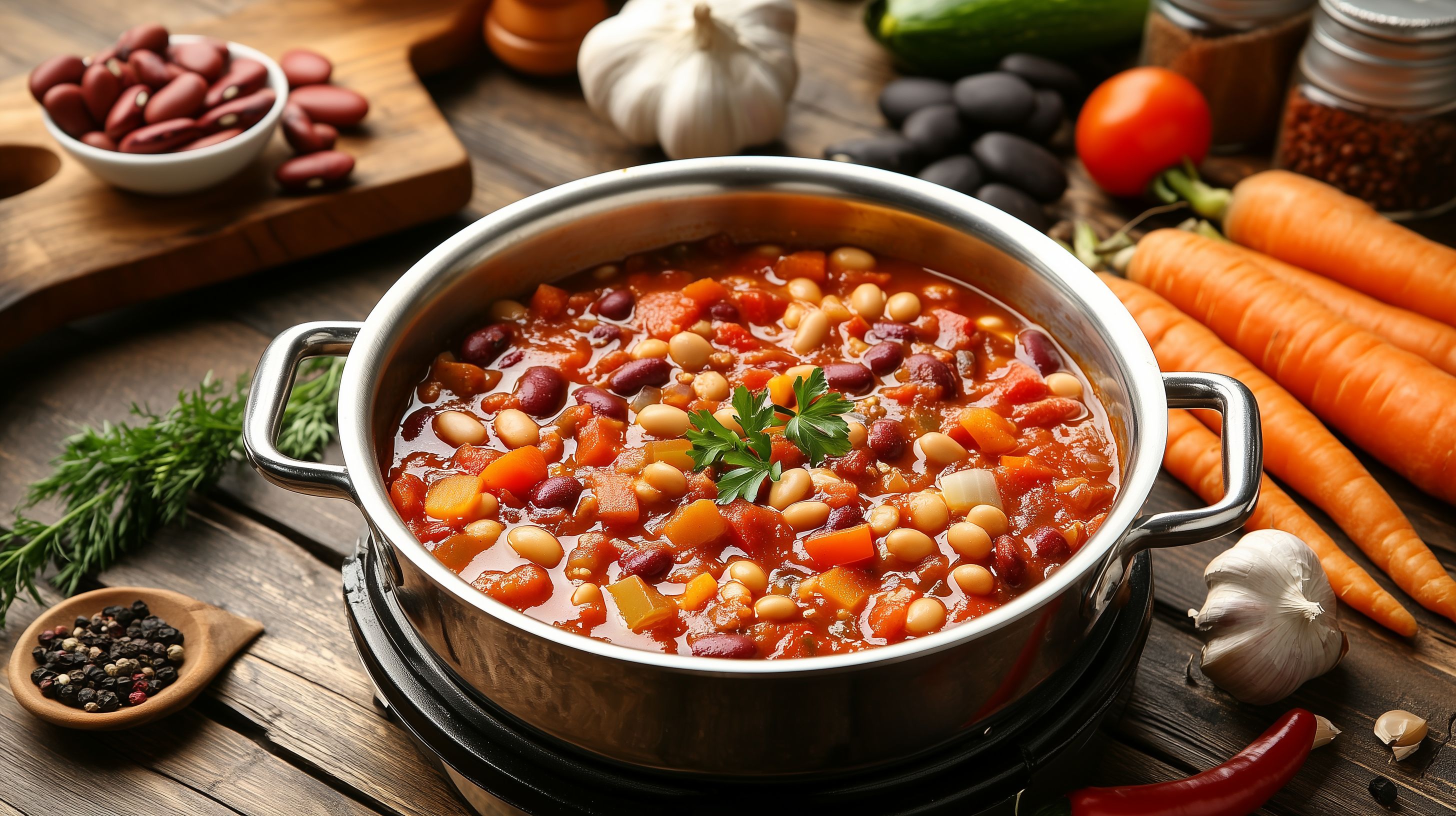 Dieses Foto zeigt einen leckeren und würzigen Bohnentopf, der in einer rustikalen Schüssel auf einem Holztisch angerichtet ist. Der Eintopf ist mit frischen Zutaten wie Karotten, Tomaten, Kräutern und Gewürzen zubereitet und sieht äußerst appetitlich aus. Die warmen Farbtöne, die eingesetzten Zutaten und die rustikale Präsentation machen das Gericht zu einem einladenden und authentischen Motiv für kulinarische Stockfotos. Dieses hochauflösende Bild eignet sich hervorragend für den Einsatz in Blogbeiträgen, Rezeptsammlungen, Newsletter oder Social-Media-Kanälen rund um das Thema gesunde Ernährung, Kochen und Gastronomie. Es steht unter einer kostenlosen Creative-Commons-Lizenz zur Verfügung.