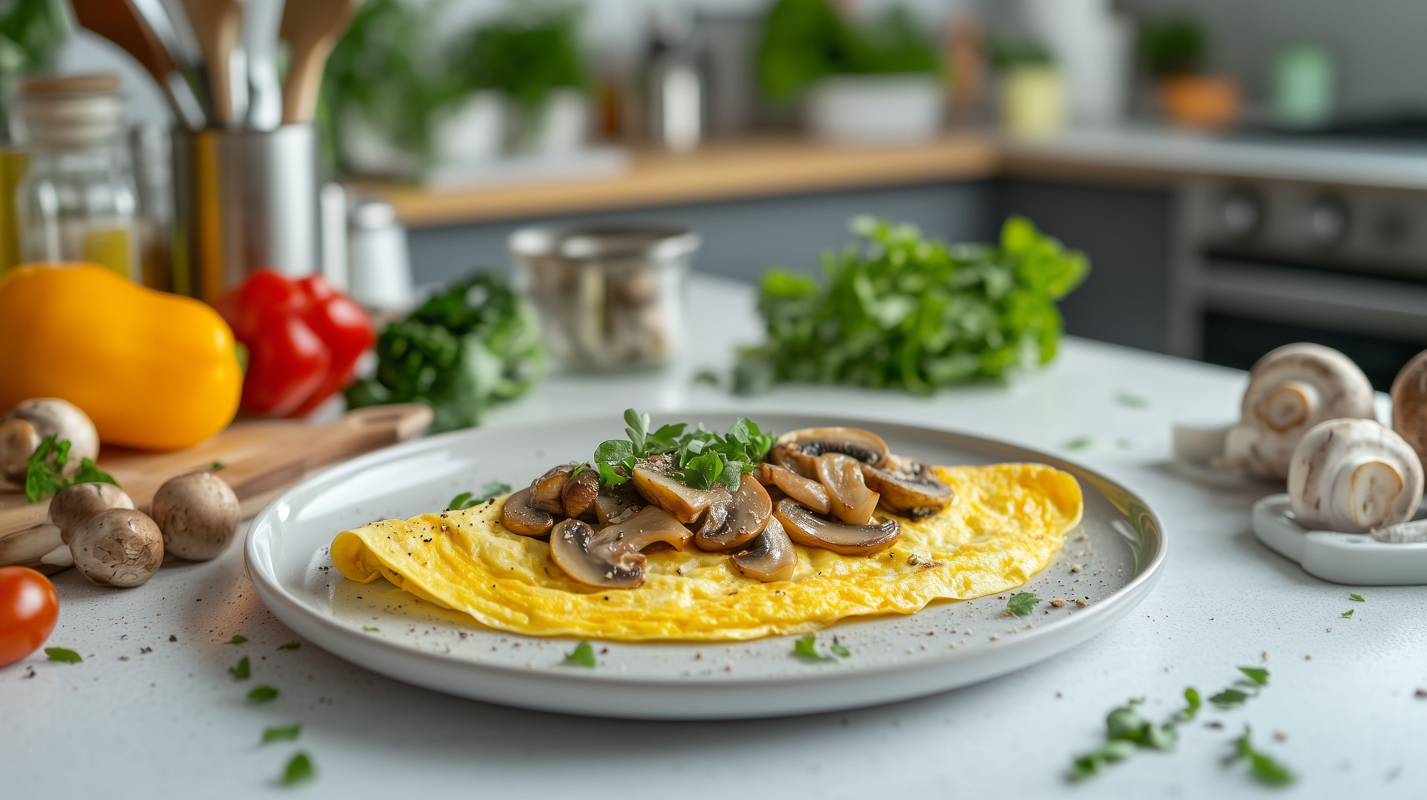 Dieses Foto zeigt ein appetitlich angerichtetes Pilzomelett auf einem Holzküchentisch. Im Vordergrund ist ein aufgeschlagenes Omelett mit sautiertem Champignonen und frischen Kräutern wie Petersilie zu sehen. Um das Omelett herum sind weitere Zutaten wie Paprika, Tomaten und Gewürze arrangiert. Die Küche im Hintergrund vermittelt eine gemütliche, moderne Atmosphäre. Dieses hochaufgelöste Foto eignet sich hervorragend für den Einsatz in Blogs, Newslettern, Social-Media-Beiträgen oder Werbematerialien rund um gesunde Ernährung, Rezepte oder die Gastronomie. Das Stockfoto ist unter einer Creative-Commons-Lizenz frei nutzbar.