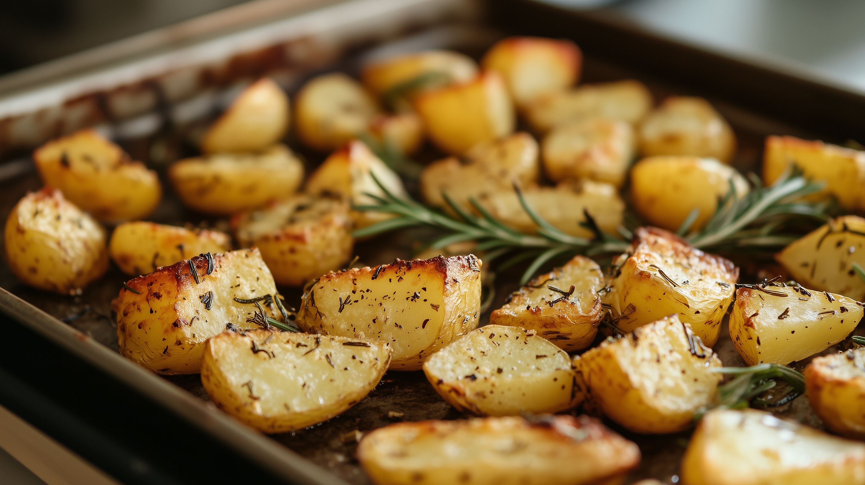 Das Bild zeigt eine Nahaufnahme von knusprigen, golden-braunen Ofenkartoffeln in einer Servierform. Die Kartoffeln sind mit Rosmarin-Zweigen und anderen Gewürzen dekoriert, was ihnen einen aromatischen und rustikalen Charakter verleiht. Diese appetitlich aussehenden Rosmarinkartoffeln wären perfekt als Beilage oder Snack, beispielsweise für einen Blogbeitrag über einfache und leckere Ofengerichte, einen Newsletter mit Rezeptideen oder als stimmungsvoller Hingucker in sozialen Medien. Dieses hochauflösende, kostenlose Stockfoto unter der Creative-Commons-Lizenz lässt sich vielseitig in verschiedenen digitalen Kanälen nutzen.