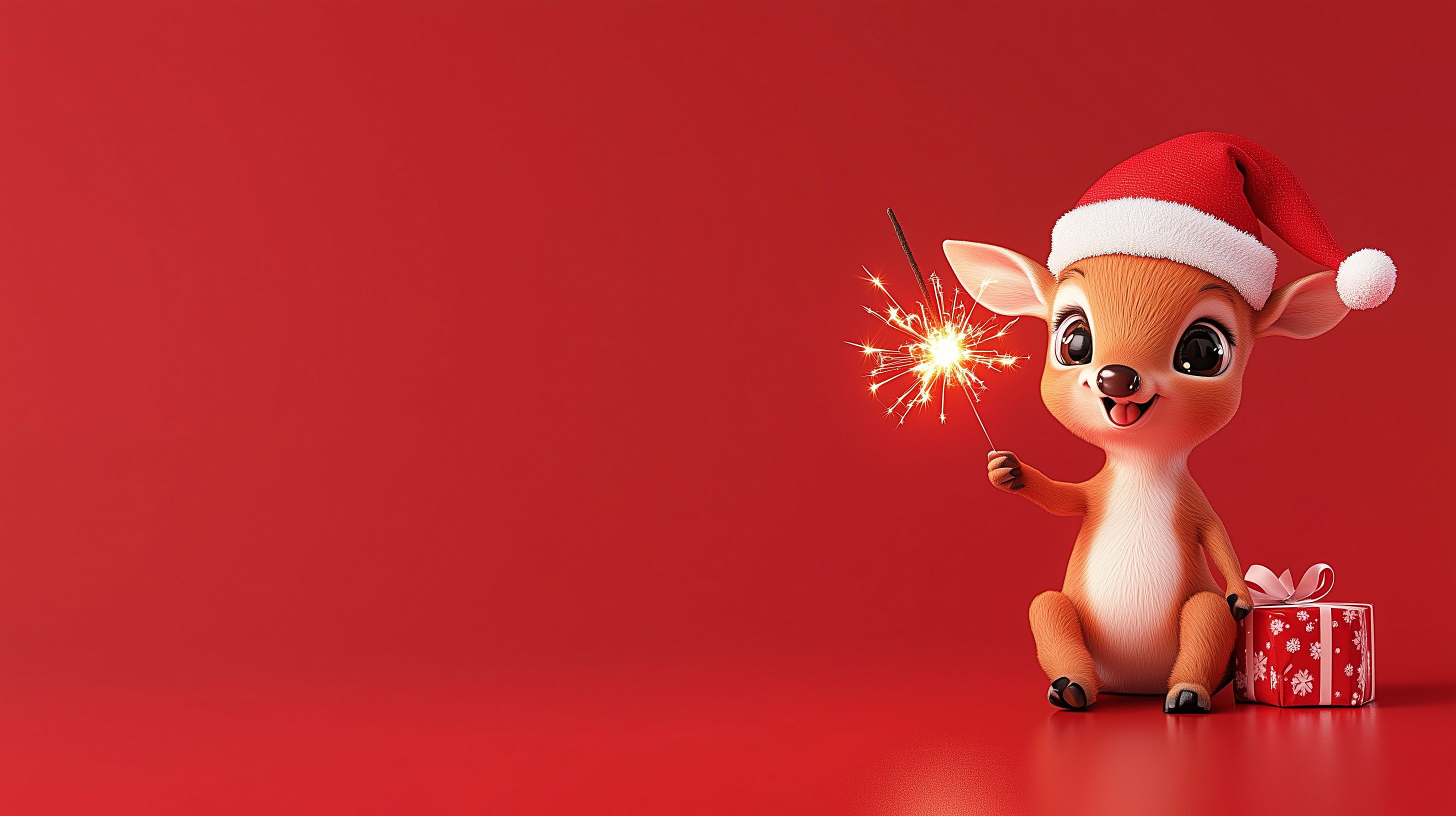 Das Bild zeigt ein süßes, lächelndes Rentier, das eine rote Weihnachtsmütze trägt und eine knisternde Wunderkerze in der Pfote hält. Vor dem einfarbig roten Hintergrund strahlt das Tier eine fröhliche, festliche Stimmung aus. Dieses kostenlose Stockfoto in hoher Auflösung eignet sich perfekt für Weihnachts-Layouts in Blogs, Newsletter-Designs, Social-Media-Posts oder Werbematerialien unter Creative-Commons-Lizenz.