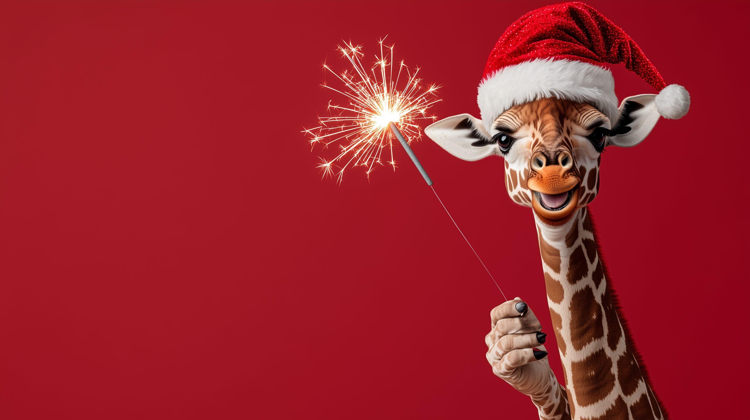 Das Foto zeigt eine lustige Giraffe, die eine rote Weihnachtsmütze trägt und ein Bengalfeuer in der Luft hält. Die Giraffe lächelt fröhlich und verleiht der Weihnachtsszene einen unerwarteten, aber charmanten Twist. Das Bild sticht durch seine lebendigen Farben und den humorvollen Kontrast zwischen dem Tier und dem festlichen Accessoire hervor. Es eignet sich hervorragend als Stockfoto für weihnachtliche Projekte in Medien, Werbung oder Social Media. Das hochauflösende Foto ist unter einer Creative-Commons-Lizenz frei nutzbar.