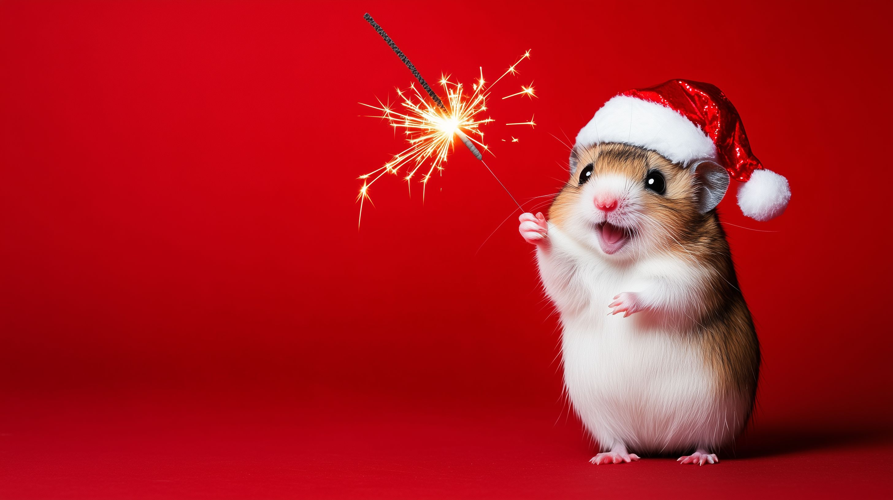 Das Foto zeigt einen kleinen, niedlichen Hamster, der eine rote Weihnachtsmütze trägt und eine leuchtende Wunderkerze in seinen Pfötchen hält. Vor einem knallroten Hintergrund blickt das Nagetier fröhlich in die Kamera. Die Komposition ist symmetrisch und zentriert, wodurch der Fokus ganz auf dem süßen Hauptmotiv liegt. Dieses besinnliche Weihnachtsmotiv eignet sich hervorragend für Weihnachtsgrüße, Blogbeiträge, Werbekampagnen oder andere saisonale Anwendungen. Als hochwertiges, lizenzfreies Stockfoto in hoher Auflösung steht es unter einer Creative-Commons-Lizenz kostenlos zur Verfügung.
