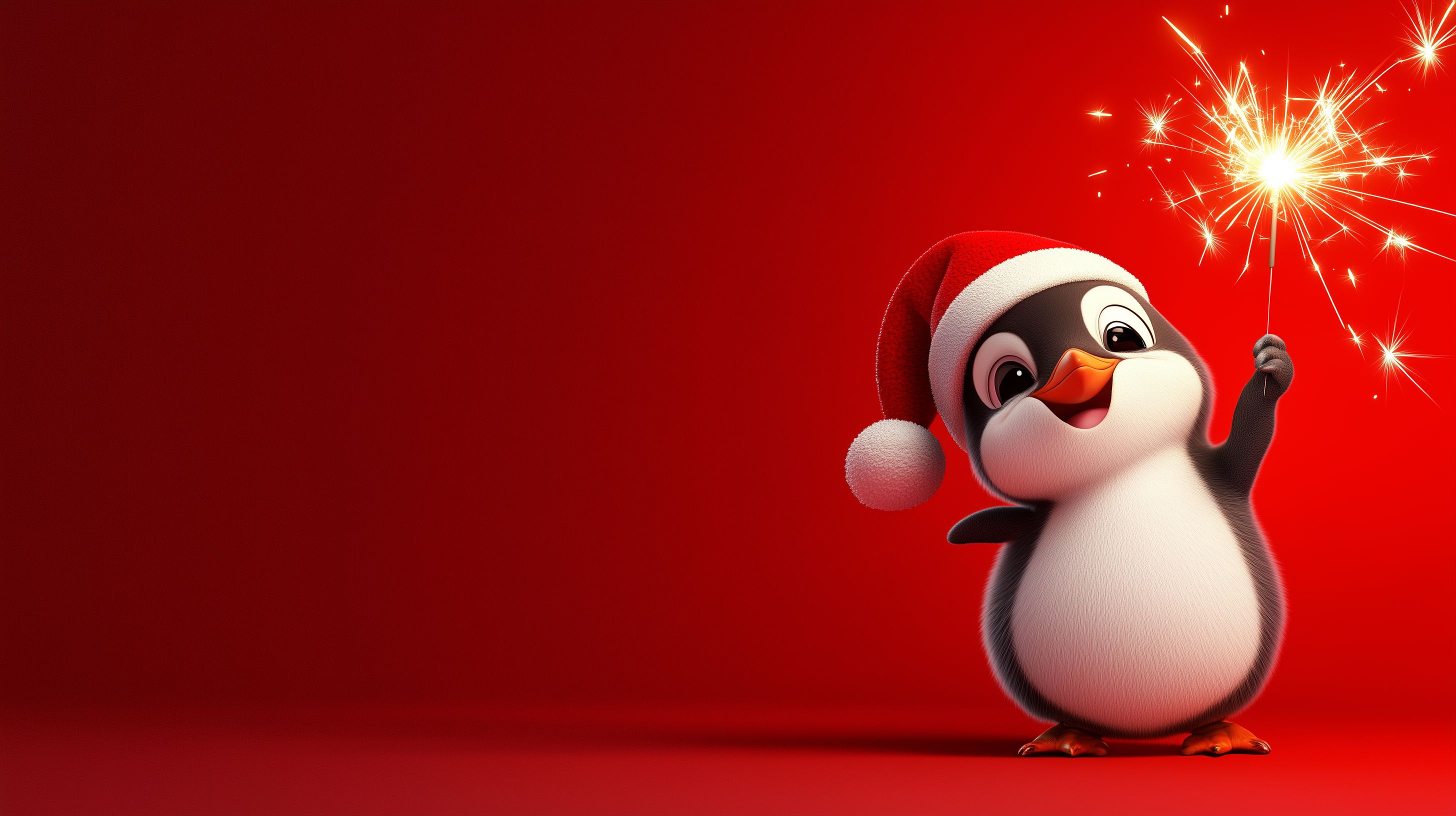 Das Bild zeigt einen niedlichen, cartoon-artigen Pinguin in einer Weihnachtsmann-Mütze, der eine Wunderkerze in der Luft hält. Der Pinguin steht vor einem kräftig roten Hintergrund, der durch bunte Funken und Lichteffekte ergänzt wird. Die fröhliche, winterliche Szene vermittelt eine festliche Stimmung und kann vielfältig in Weihnachts- oder Neujahrskampagnen, Blogbeiträgen, Social-Media-Posts oder Werbematerialien eingesetzt werden. Als kostenloses Hochauflösungs-Stockfoto mit Creative-Commons-Lizenz ist das Bild für verschiedenste Zwecke ideal geeignet.