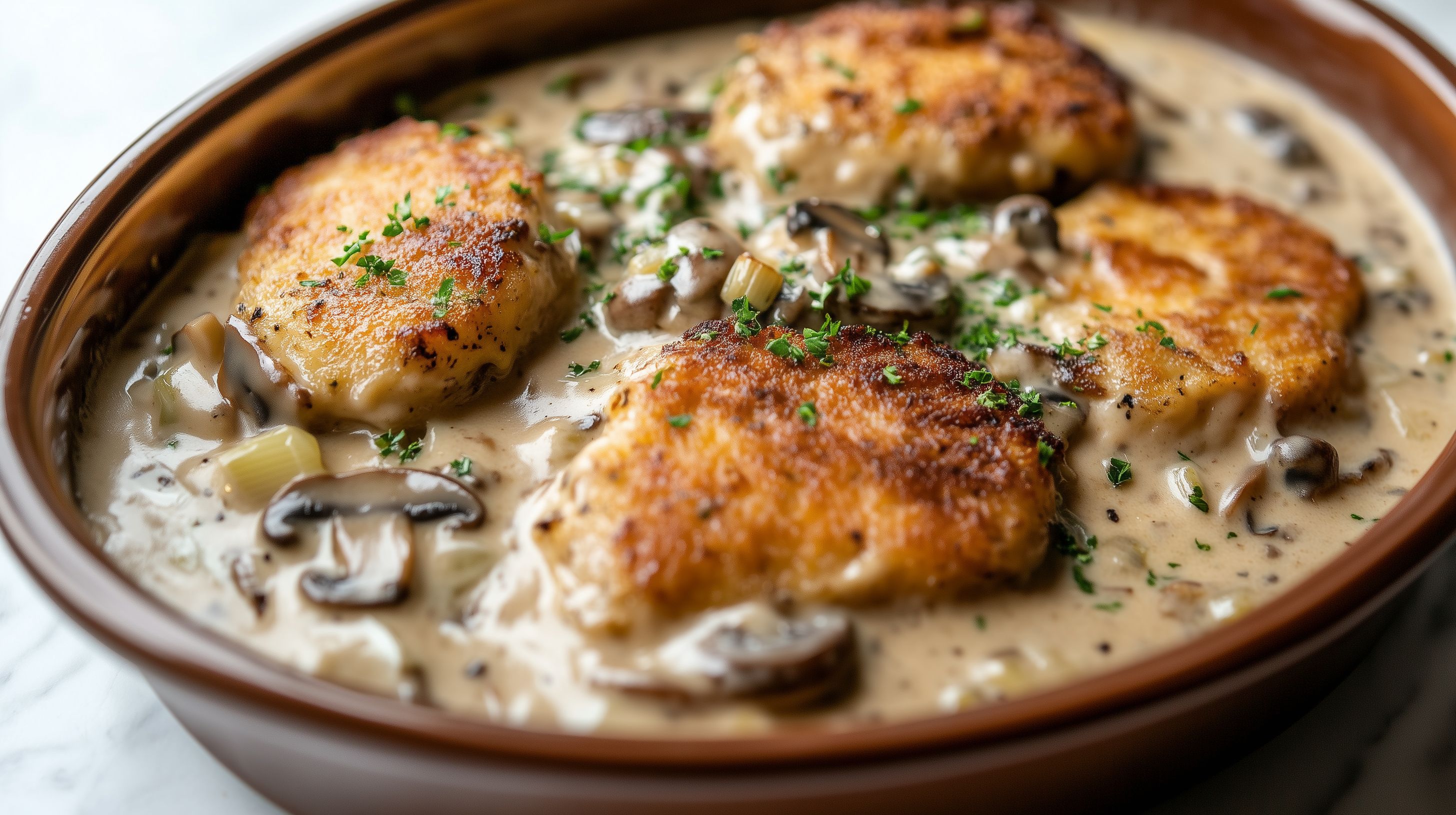 Dieses appetitliche Foto zeigt ein leckeres Hähnchen-Pilz-Gericht in einer rustikalen Keramikschüssel. Der Auflauf ist mit einer cremigen Pilz-Lauch-Sauce übergossen und mit frisch gehackter Petersilie garniert. Das Bild strahlt eine gemütliche und einladende Atmosphäre aus und eignet sich hervorragend als kostenloses Stockfoto für Rezeptblogs, Kochportale oder Werbekampagnen rund um das Thema Gastronomie und Kulinarik. Die hochauflösende Aufnahme in ansprechender Optik vermittelt den Eindruck eines frischen, schmackhaften Gerichts, das Appetit auf mehr macht. Dieses kostenlose Stockfoto steht unter einer Creative-Commons-Lizenz zur Verfügung.