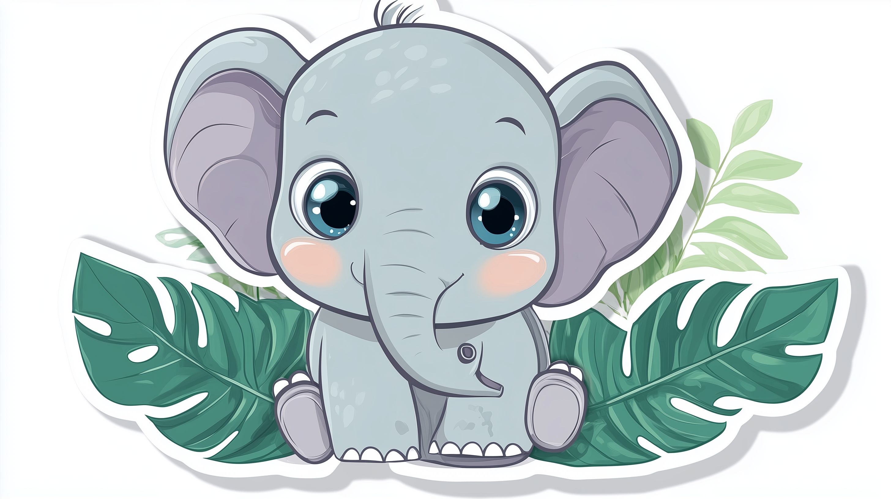 Das Bild zeigt einen süßen, cartoon-artigen Elefanten mit großen Augen und rosa Wangen, der in einer tropischen Umgebung sitzt. Er ist umgeben von grünen Blättern und Pflanzen, die eine natürliche und lebendige Atmosphäre schaffen. Das Bild strahlt Fröhlichkeit und Freude aus und eignet sich hervorragend für den Einsatz in Kindergeschichten, Einladungen, Geburtstagskarten, Blogbeiträgen oder Werbematerialien. Das hochauflösende und kostenlose Stockfoto ist unter der Creative-Commons-Lizenz verfügbar.