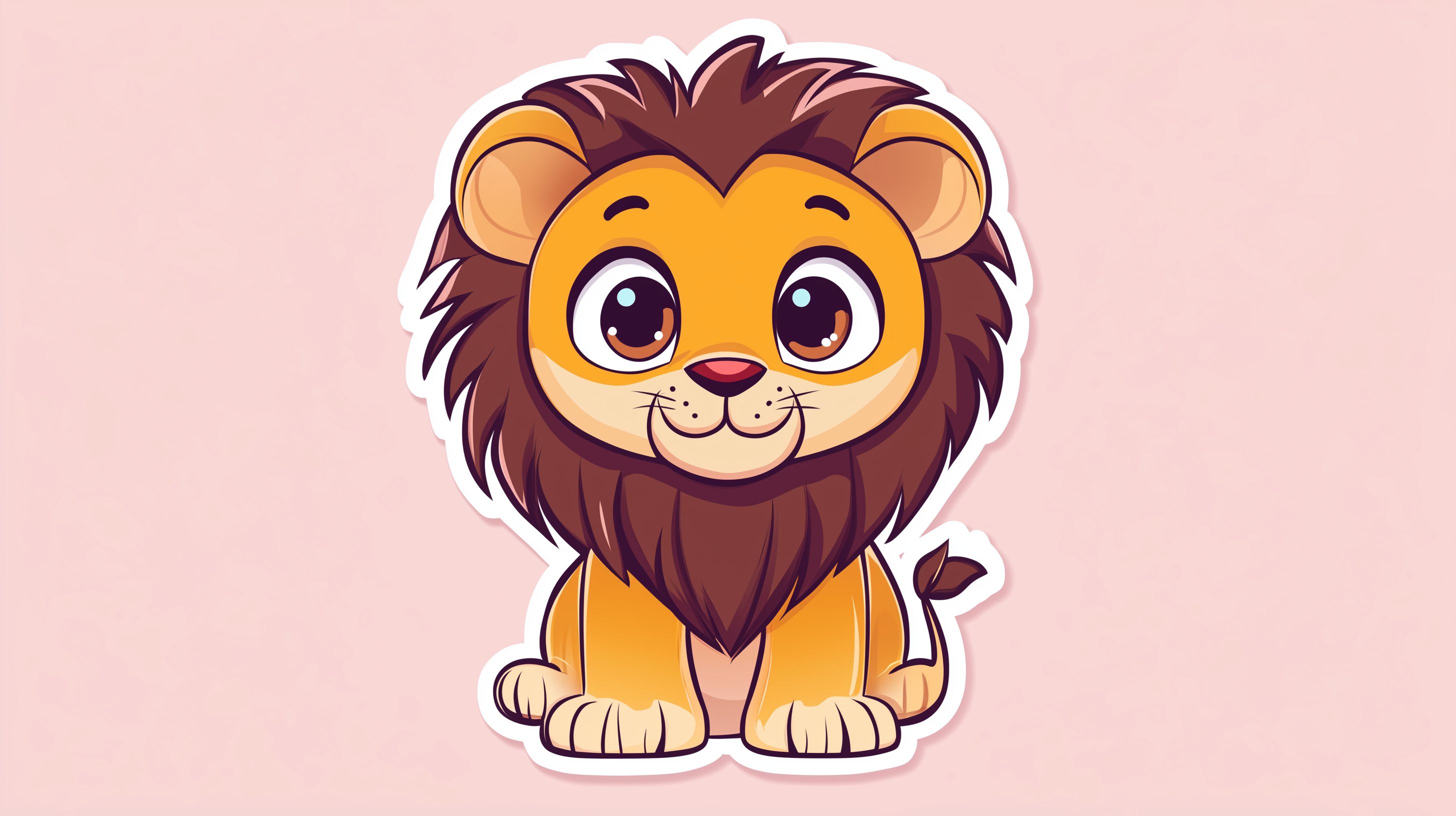 Das Bild zeigt einen niedlichen, cartoon-artigen Löwen mit großen, ausdrucksvollen Augen und einem freundlichen Gesichtsausdruck. Der Löwe hat eine braune Mähne und ein oranges Fell, was ihn sehr süß und kindlich erscheinen lässt. Das Bild ist farbenfroher, digitaler Vektorkunststil mit einem gepunkteten Hintergrund in einem sanften Rosa.