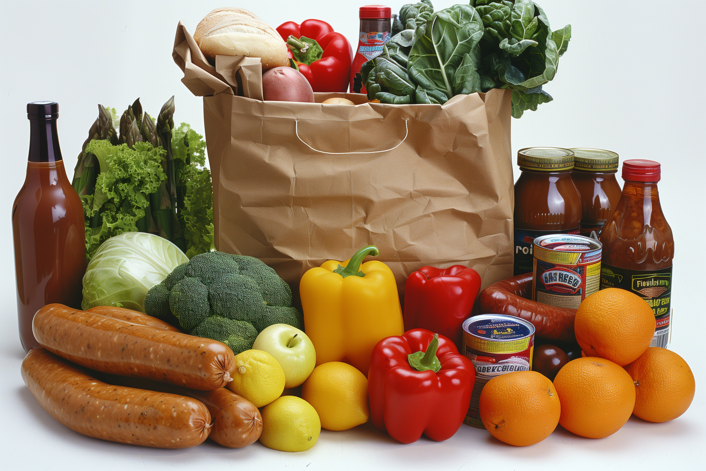 Das Bild zeigt eine Vielzahl an gesunden Lebensmitteln in einer braunen Papiertüte. Der Fokus liegt auf den frischen Zutaten wie Obst, Gemüse, Gewürzen und Konserven, die sorgfältig angeordnet sind. Die Perspektive ist frontal, die Beleuchtung gleichmäßig und die Farbpalette besteht hauptsächlich aus kräftigen Rottönen, Grüntönen und Gelbtönen. Die Komposition ist ausgewogen und vermittelt einen Eindruck von Frische, Natürlichkeit und Gesundheit.