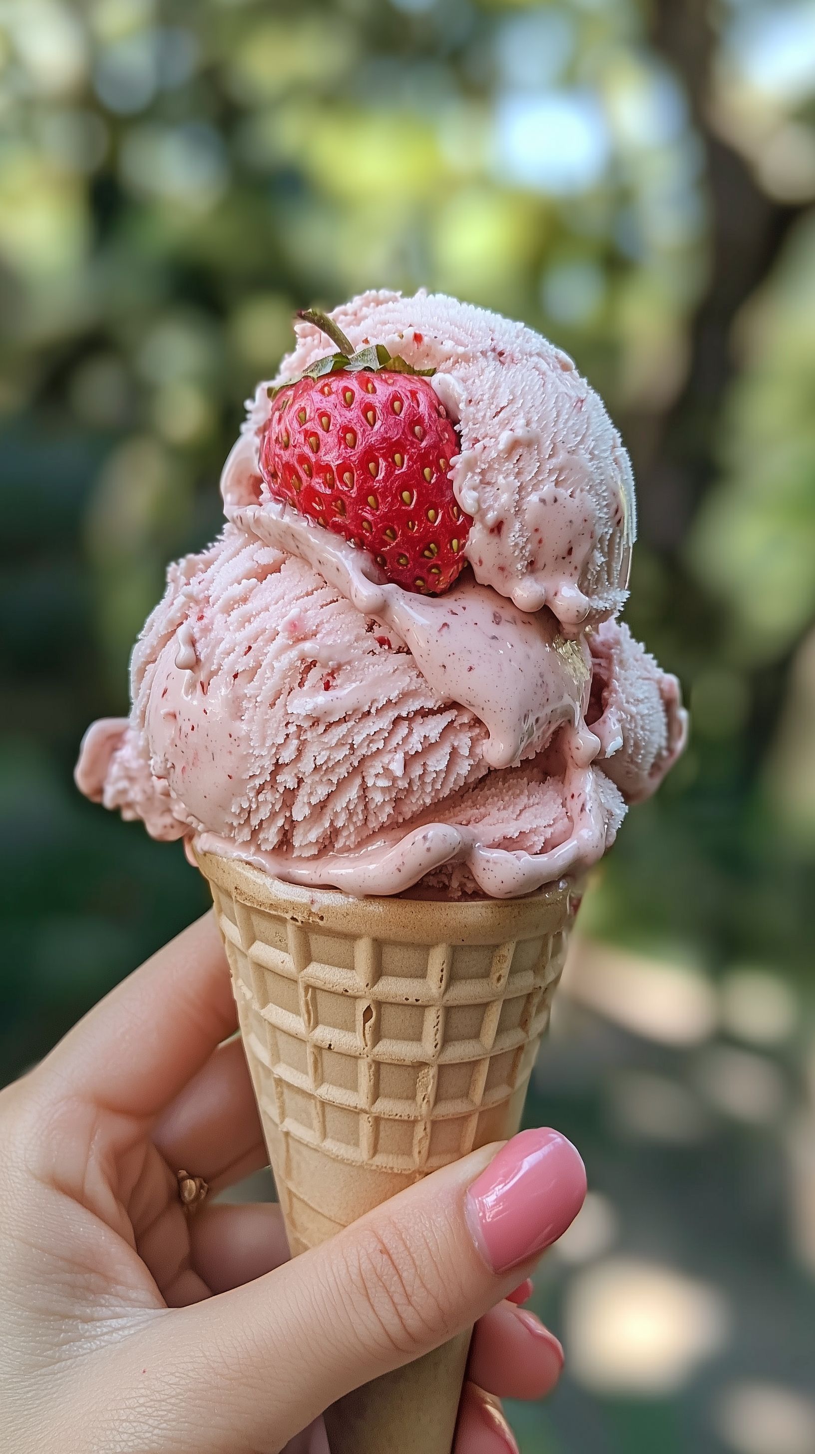 Das Foto zeigt ein Eisbecher mit leckerer Erdbeer-Vanille-Eiscreme, serviert in einem knusprigen Waffelkegel. Die Erdbeere auf der Spitze verleiht dem Eis einen fruchtig-süßen Geschmack und eine lebendige rote Farbe. Die Szenerie ist eingebettet in eine natürliche, grüne Umgebung, was dem Bild eine sommerliche, erfrischende Atmosphäre verleiht. Dieses Stockfoto in hoher Auflösung eignet sich perfekt für den Einsatz in Blogbeiträgen, auf Social-Media-Kanälen oder in Werbekampagnen rund um Sommergenüsse, Eiswaren oder Cafébetriebe. Das Foto ist unter einer kostenlosen Creative-Commons-Lizenz verfügbar.