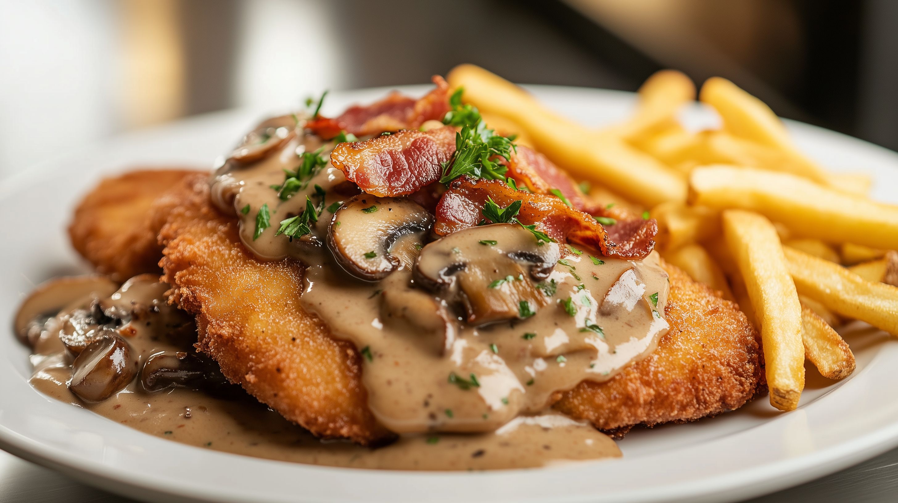 Dieses Foto zeigt ein traditionelles deutsches Jägerschnitzel mit einer köstlichen Pilzrahmsauce. Das goldbraun ausgebratene Schnitzel ist mit frischen Pilzen und würziger Sauce serviert und wird von knusprigen Pommes Frites begleitet. Die Anordnung auf einem rustikalen Holztisch verleiht dem Gericht eine authentische, gemütliche Atmosphäre. Dieses hochwertige Stockfoto eignet sich hervorragend für die Verwendung in Gastronomie-Werbung, Restaurantmenüs, Rezeptbüchern oder kulinarischen Blogs. Es ist in hoher Auflösung und unter einer Creative-Commons-Lizenz verfügbar, sodass es kostenlos genutzt werden kann.