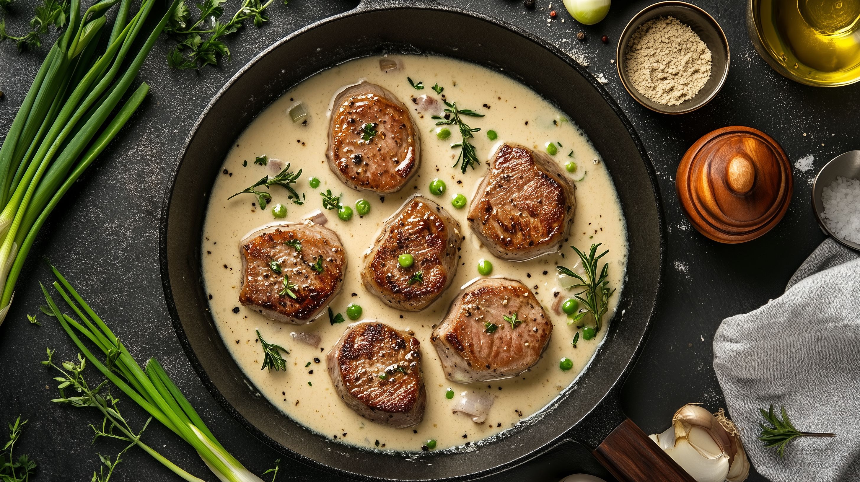 Dieses sinnliche Foto zeigt saftige Schweinemedaillons in einer cremigen Sauce, angerichtet auf einem dunklen Untergrund. Die Medaillons sind goldbraun angebraten und werden von einer feinen Sauce mit Kräutern umhüllt. Rund herum befinden sich Zutaten wie Knoblauch, Öl und Gewürze, die den appetitlichen Eindruck komplettieren. Das Bild strahlt eine rustikale, authentische Atmosphäre aus und eignet sich hervorragend als hochwertiges, kostenloses Stockfoto für Blogs, Social Media-Posts, Rezeptsammlungen oder Werbekampagnen rund um das Thema Kochen und Kulinarik. Mit seiner hohen Auflösung und der Creative-Commons-Lizenz können Gestalter und Redakteure das Foto frei und flexibel in ihren Projekten einsetzen.